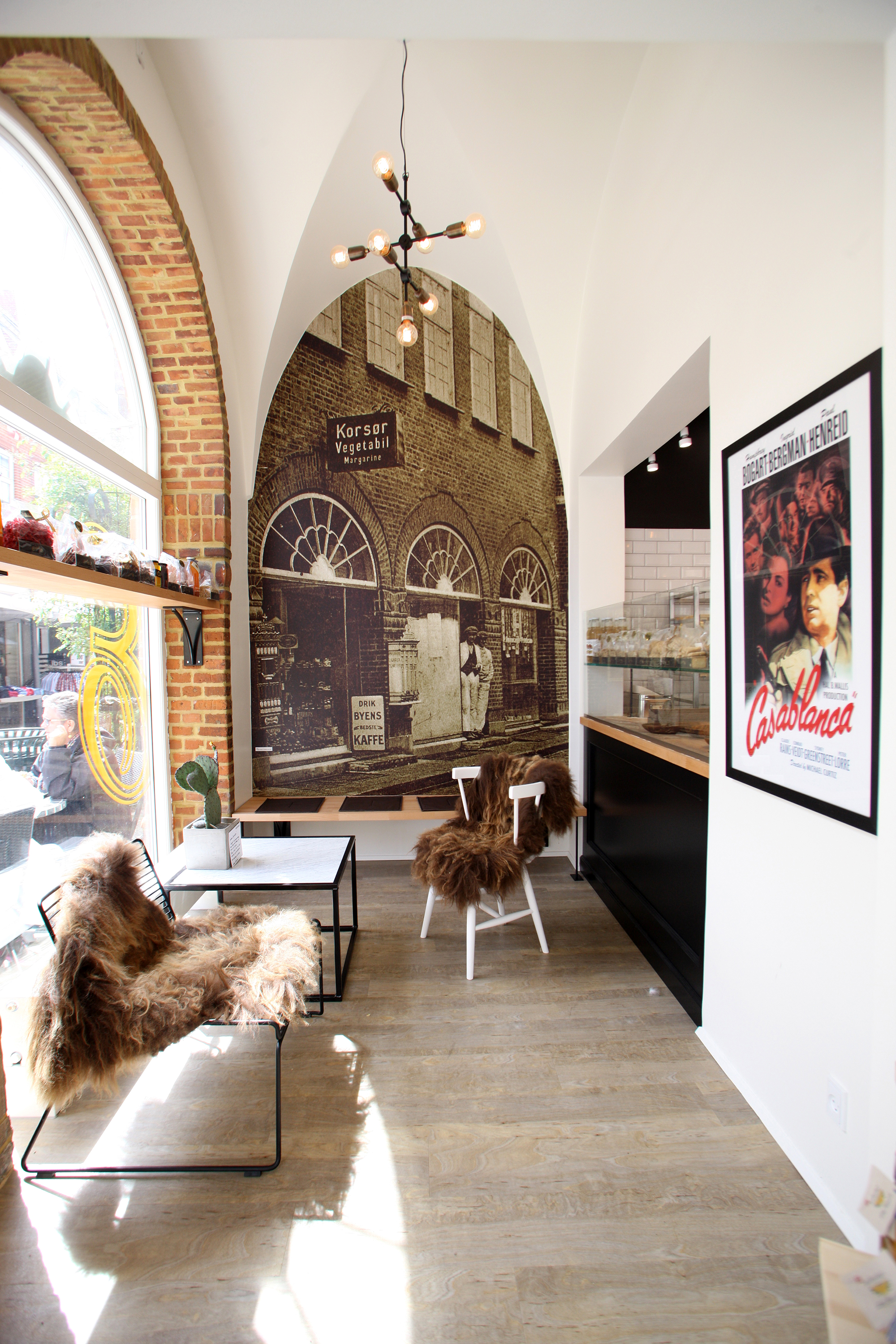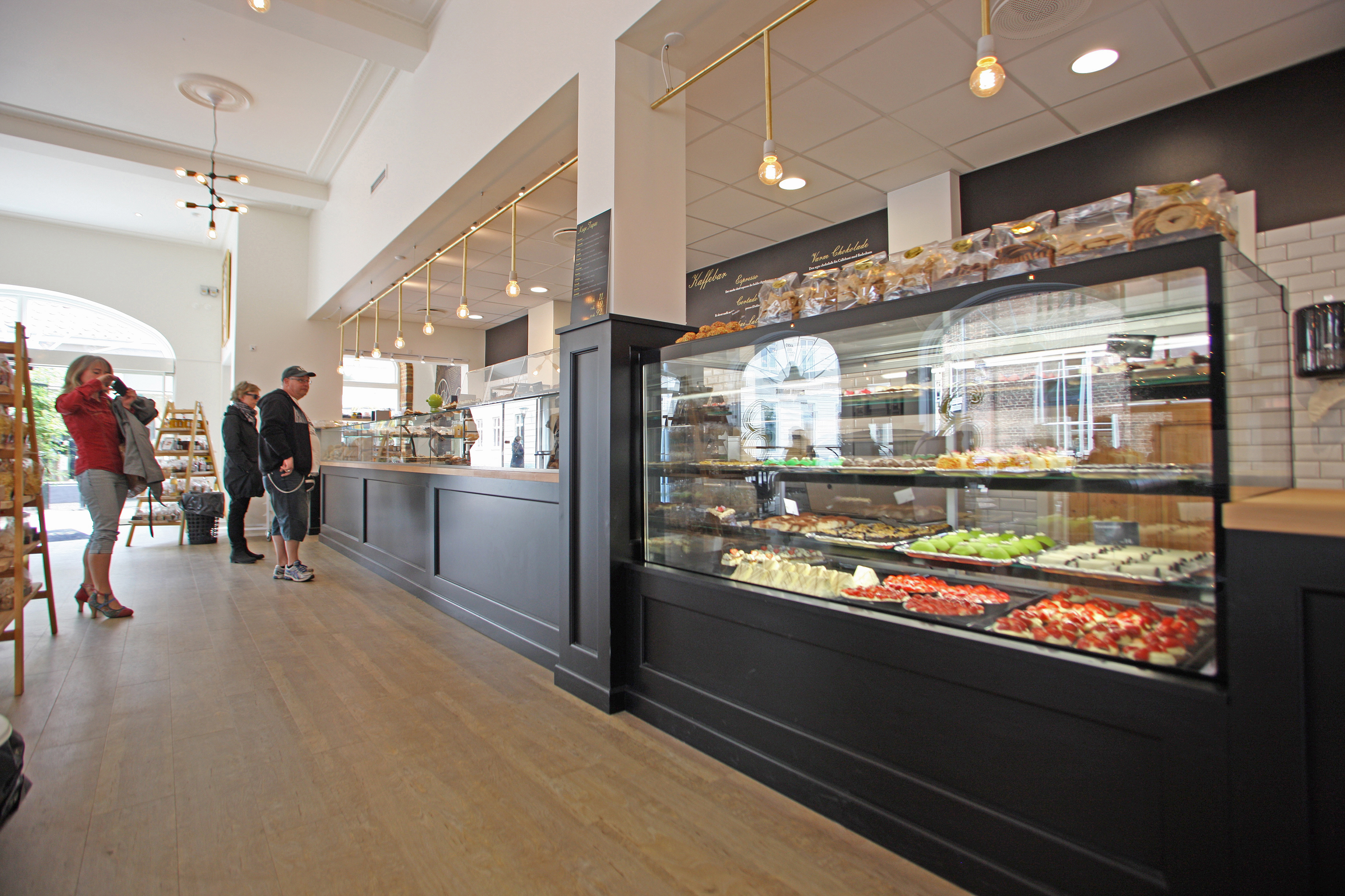 ”Da vi fik revet det ekstremt lave loft, der havde været i købmandsbutikken ned, viste det sig, at de oprindelige lofter havde været utroligt høje, og den smukkeste stuk kom frem. Den er naturligvis bevaret i cafeen”, fortæller Tina Switzer.