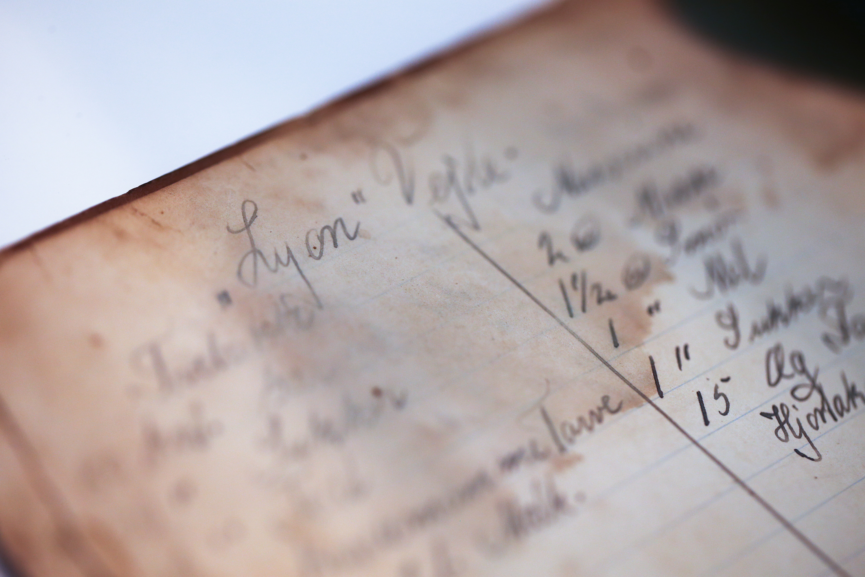 Paletkniv. Og jeg har min oldefars gamle. Han var 15 år gammel, da han kom i lære ved konditoriet Lyon i Vejle, og jeg har også hans elevbog, hvor han med pæn og sirlig skrift har skrevet kommentarer til opskrifterne. Jeg arbejder og leger mine opskrifter frem – og lægger dem i sikkerhed i Dropbox.