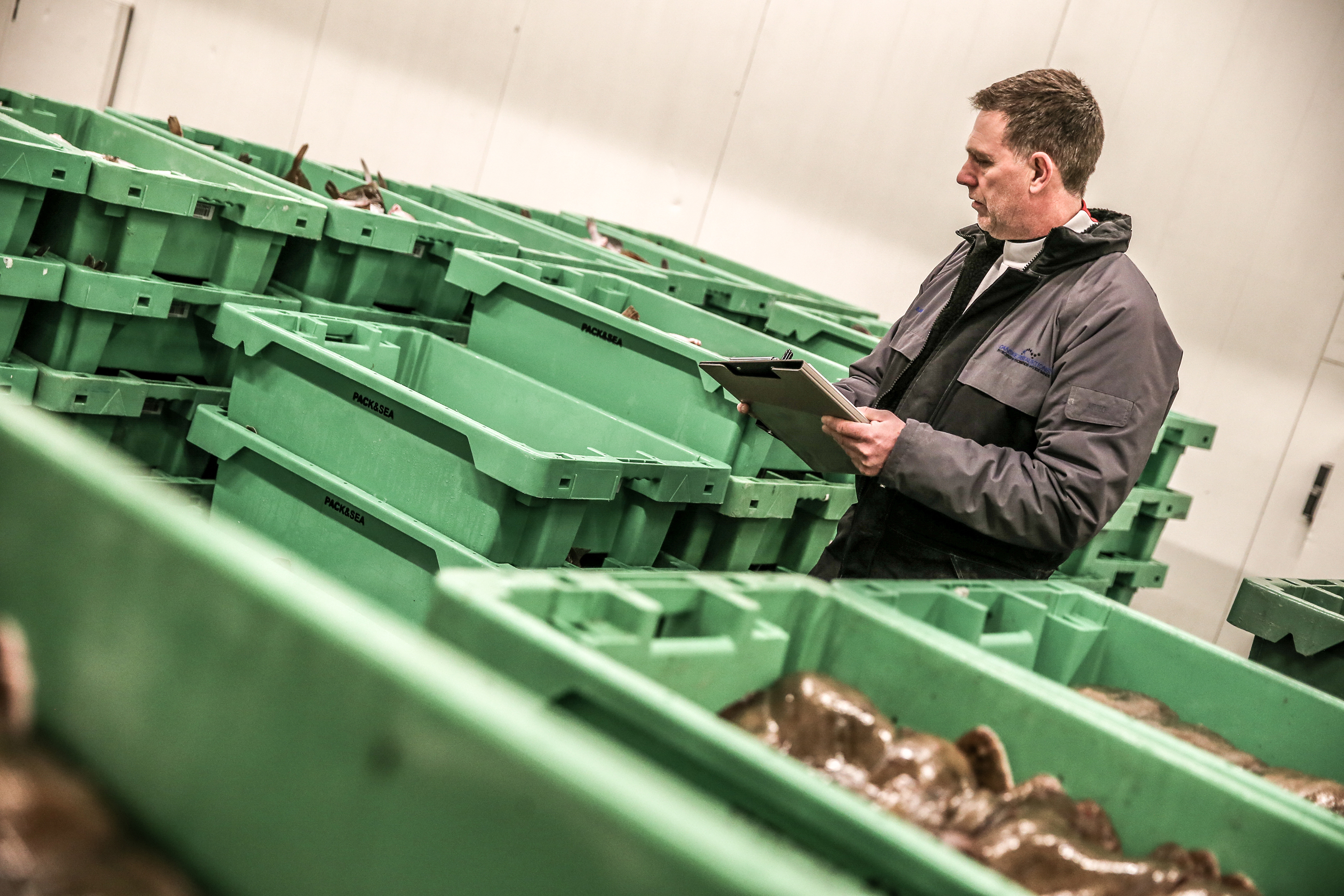 Når alle fisk er lagt i de grønne plastickasser, sat på paller og fordelt efter arter på auktionen, foretager Bjarne Christensen og hans medarbejdere den endelige vurdering af fisken. De har ti forskellige kvalitetsgradueringer, hvor den absolutte topkarakter typisk gives til søpakket.
