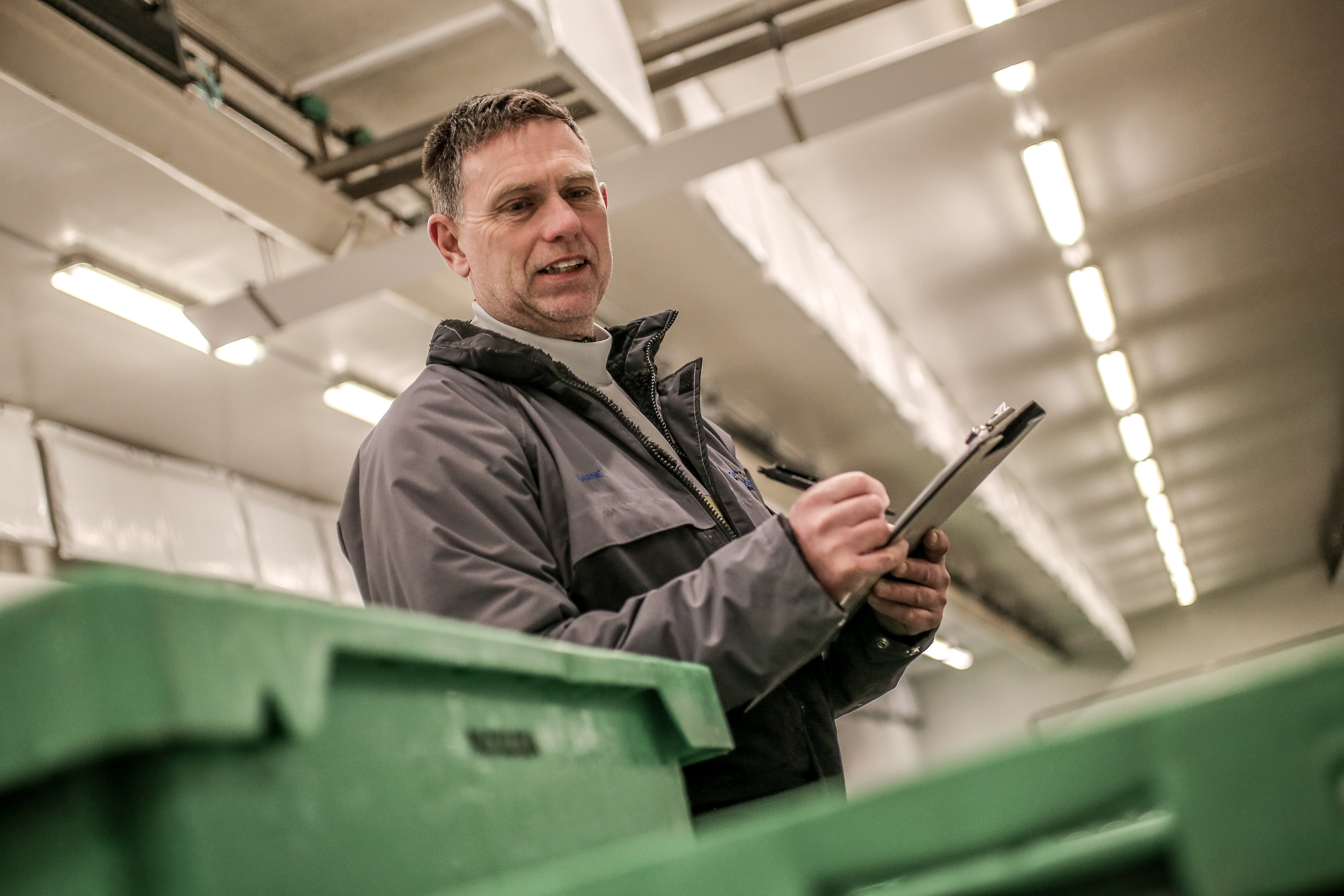 ”Fiskerne skal inden kl. 14 dagen før melde, at de kommer ind med fisk til auktionen. En stor del er renset og pakket i kasser ude på fartøjet – det vi kalder søpakket – og så kender vi på forhånd til størrelser, vægt og hvor mange dage, der er gået, siden de enkelte fisk blev hevet ombord. De laster, der først skal sorteres efter størrelse og vægt på auktionen, har vi dog også en fornemmelse af, da vi ved, hvor længe båden har været afsted, og hvilke fangstmetoder de bruger. Vejr og vind spiller også ind på kvaliteten”, siger Bjarne Christensen.
