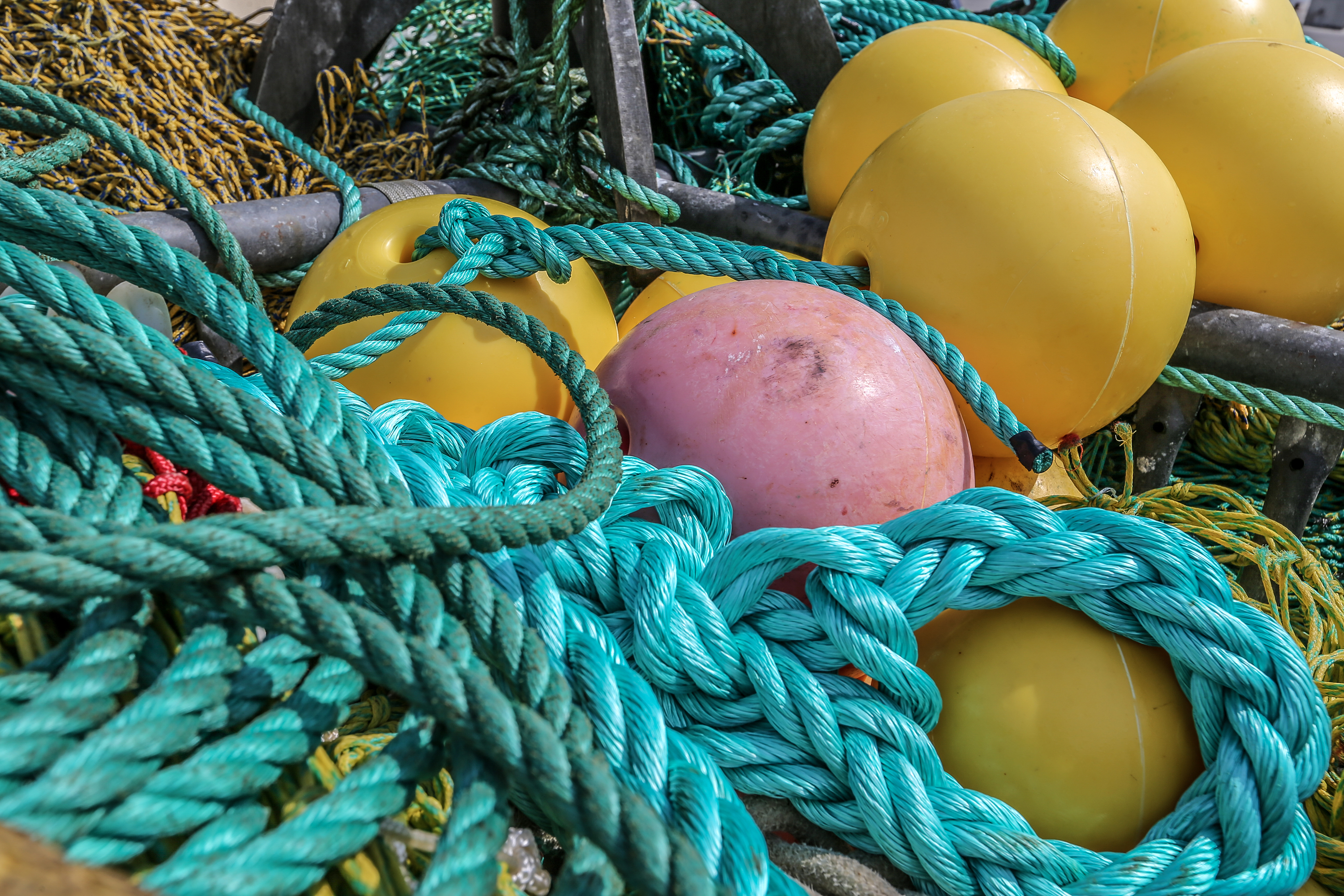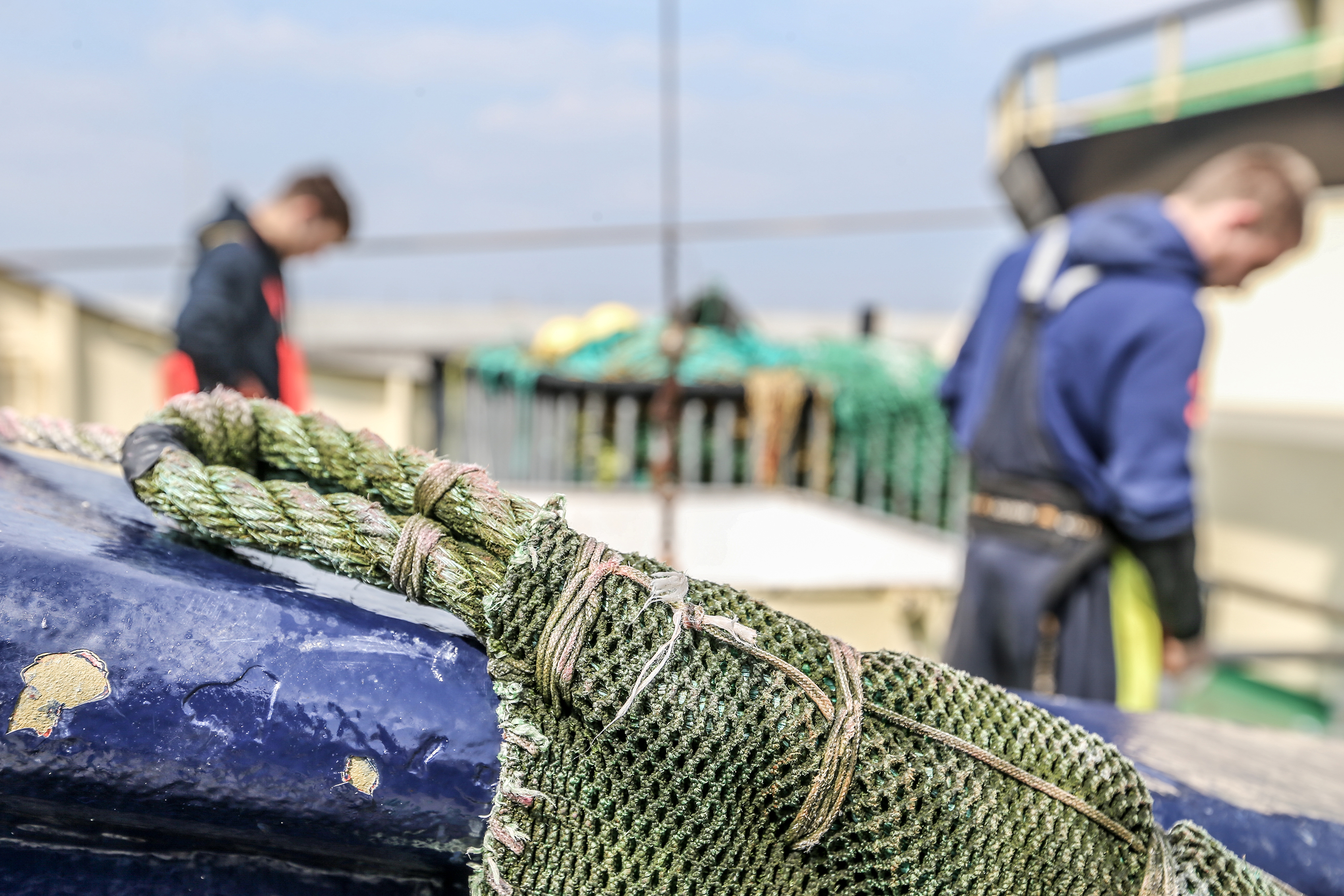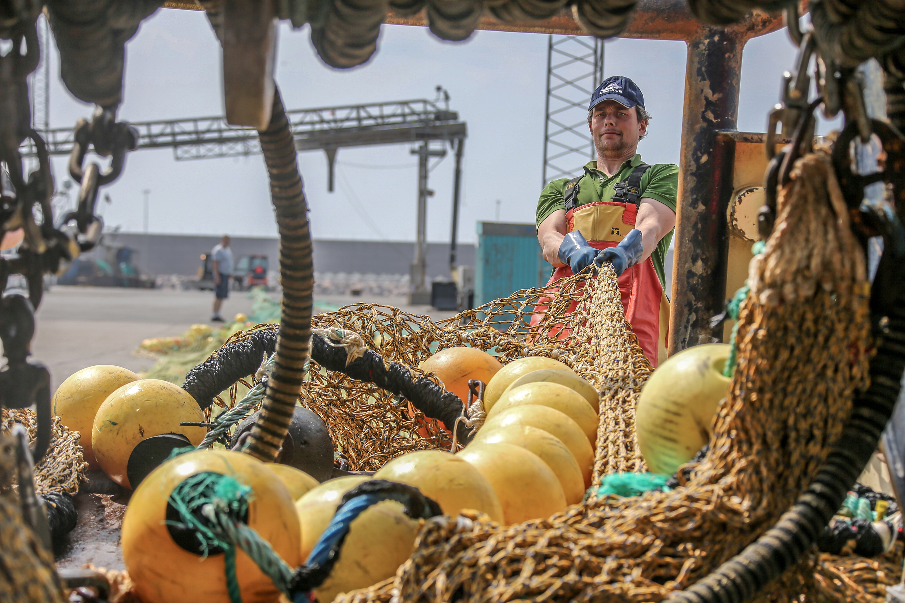 På en mole ved Nordsøkaj i Hvide Sande er lange to-trawl trukket ud i fuld længde fra fiskefartøjet RI 426 Mette Janni. Sammen med en vodbinder er de to indehavere af skibet, Lars Høj og Enevold Mose Sørensen, i gang med at lappe de huller, der opstår i trawlet ved fiskeriet efter rødspætter og pighvar i Nordsøen.
