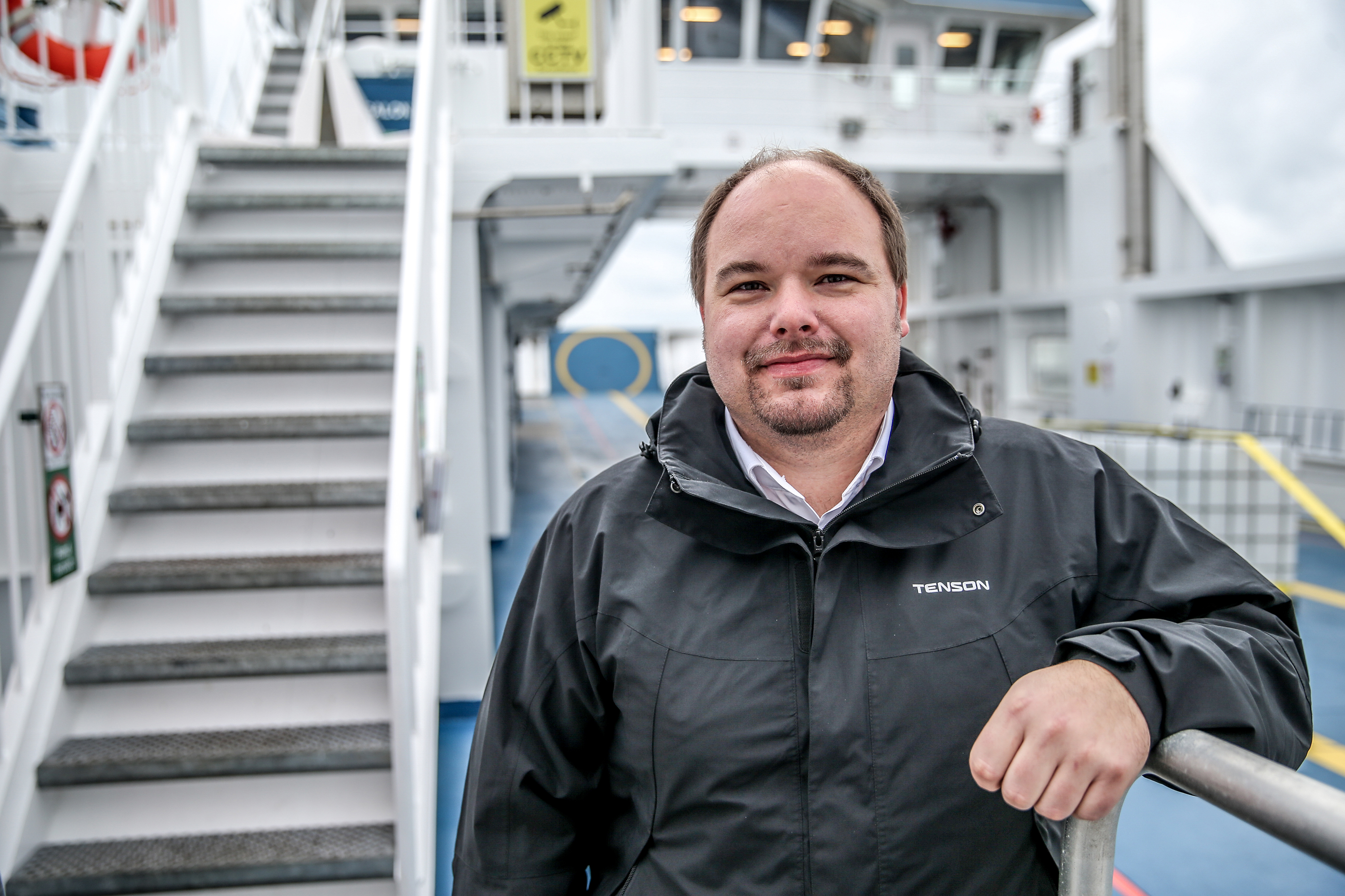 ”Jeg kommer fra langfart med udmønstringer i op til tre måneder. Det er lang tid væk fra kone og børn, så min familie ville gerne, at jeg skulle i land. Og da stillingen som overfartsleder blev slået op, søgte jeg den. Jeg synes, at det er meget interessant og kan godt lide kontorarbejde, som jeg blandt andet har siddet to år med hos Ispatruljen i Grønland, hvor jeg var ansat ved Royal Arctic Line, før jeg kom her. Og selv om det her er meget anderledes og et mindre fartøj, så er papirarbejdet stadigt det samme”.