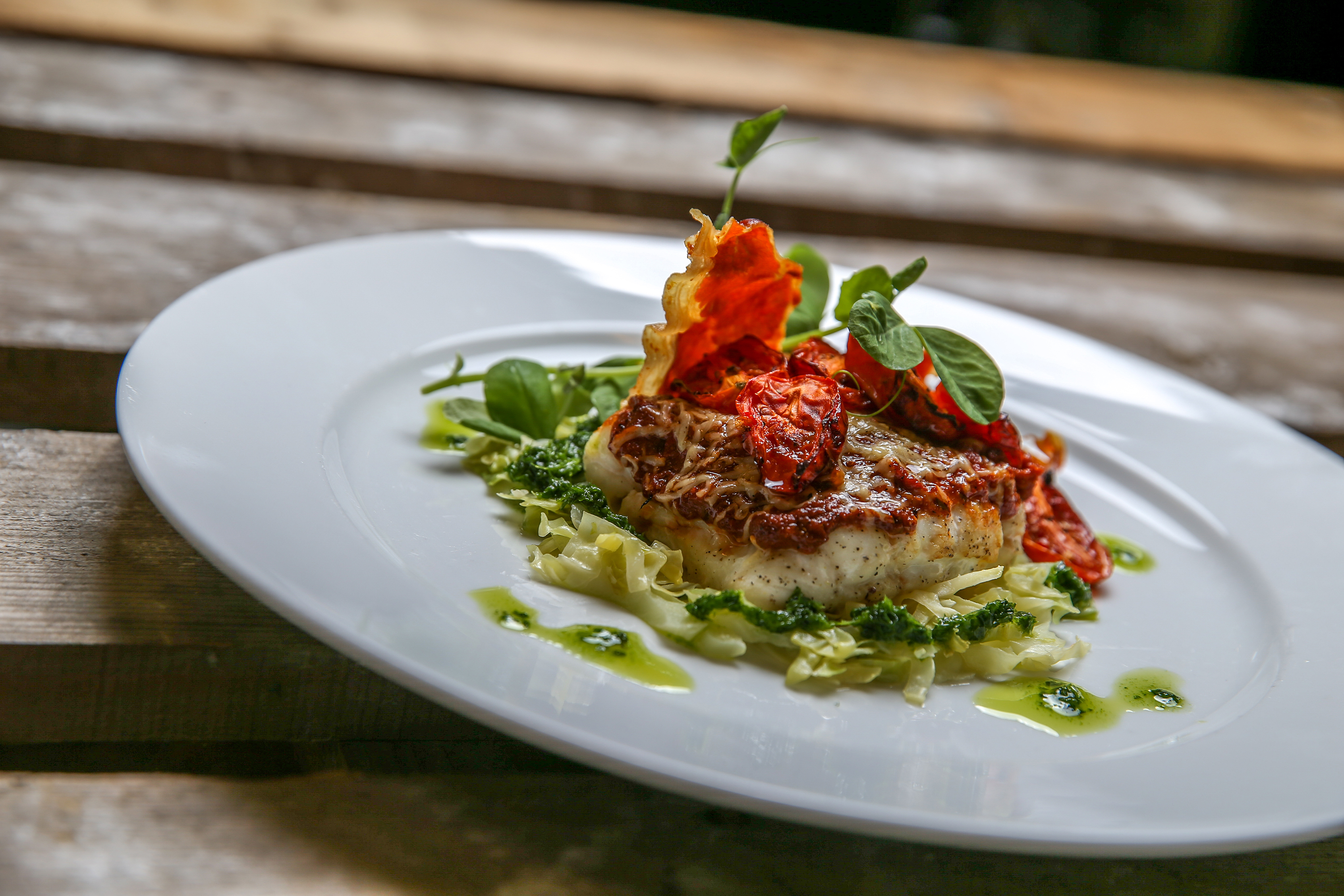 Server fisken på salat eller sauteret kål, pynt den af med de bagte tomater og krydderurter efter smag.