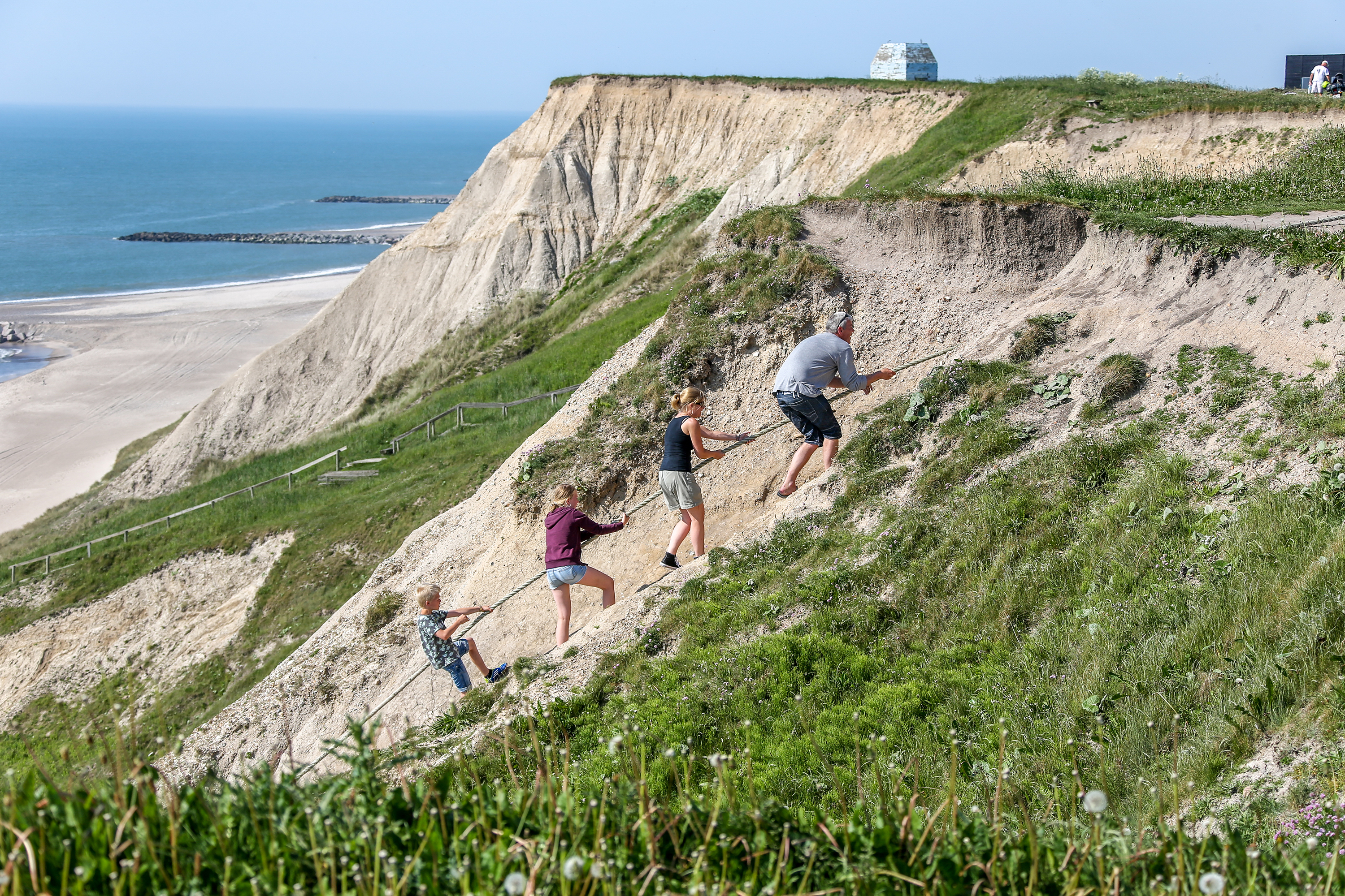 ”Geoparken er også en klima-historie, der fortæller om, hvordan klimaet gennem tiderne har ændret sig og dermed har påvirket landskabet. Geoparken har derfor en uddannelses- og formidlingsrolle i forhold til Klimatoriet, der skal fortælle blandt andet skoleelever om fremtidens klima. Vi kan fortælle om de gamle kystlinjer, og hvordan Nordsøen har været tørlagt, så man i princippet kunne gå til Irland. Havspejlet har været både 150 meter lavere og to en halv meter højere end i dag. Nogle af de skrænter fra stenalderen,