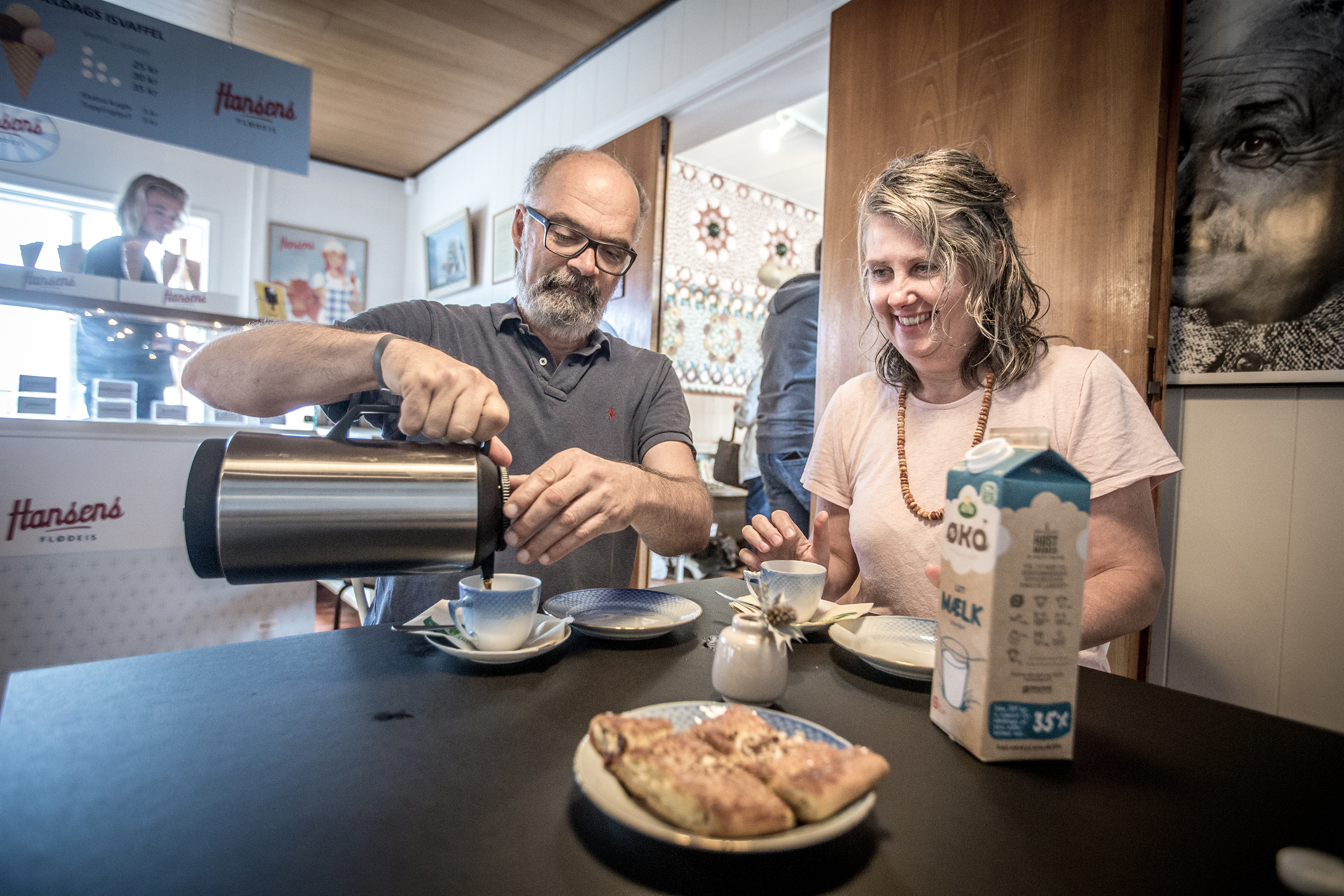 ”Det var en bestilling! De vil have 20 gange kaffe og kringle og mormor til at fortælle!”. Sigurd Kirkedal Koustrup vender ivrigt tilbage fra telefonen ved kassen til sin familie omkring den sene frokost ved køkkenbordet ’back-stage’ i Sneglehuset.