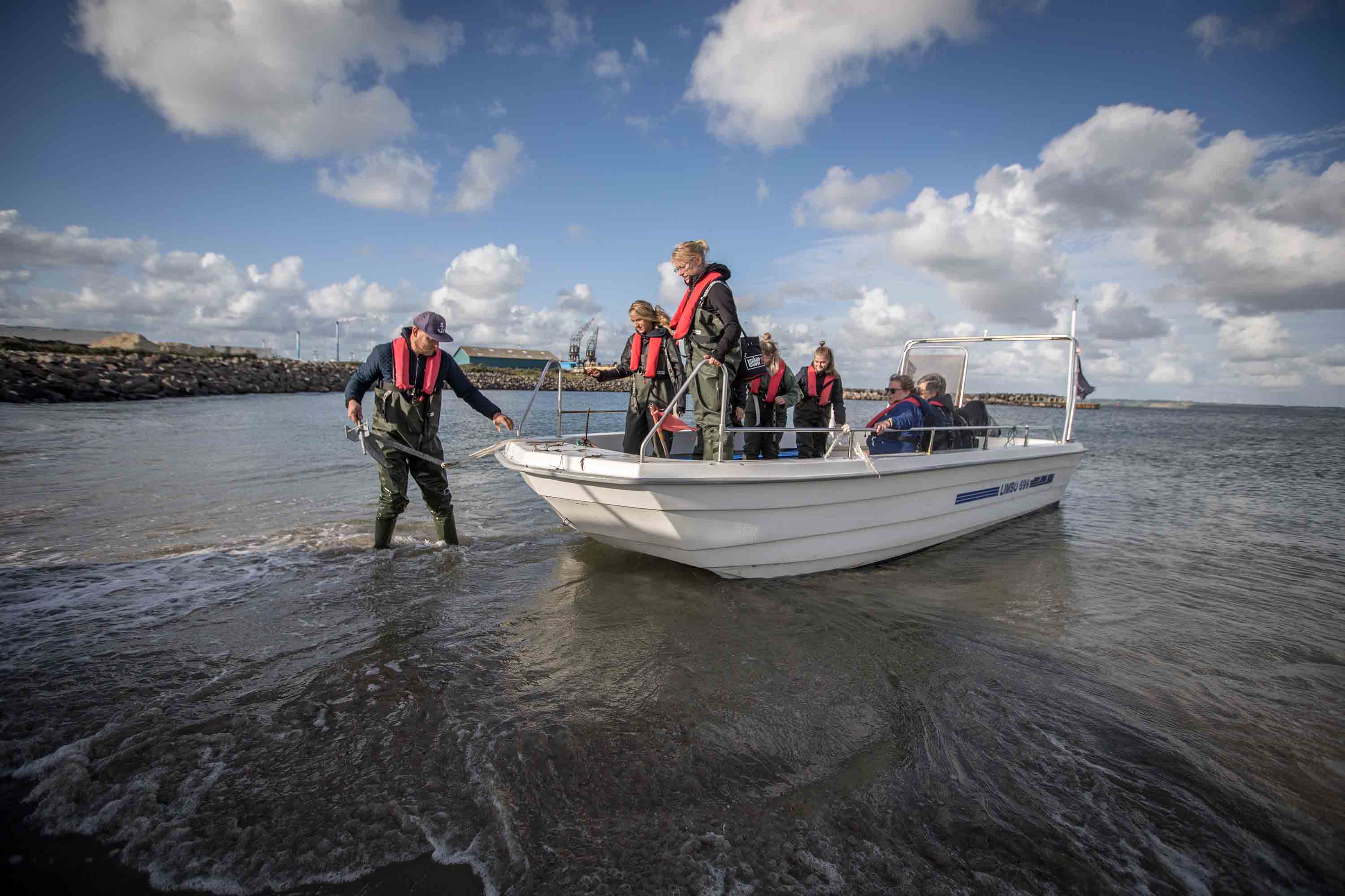 De er kørt i akvariets traktorbus ud til Limfjorden, hvor de udstyret med krabbe-fiskestænger, net og sier er gået i gang med at udforske livet i vandet. Det er ellers de selvsamme krebsdyr, krabber og fisk, som kan opleves tørskoet inde på JyllandsAkvariet, men denne tur giver gæsterne mulighed for selv at komme med helt derud, hvor dyrene lever, møde dem i deres miljø, røre og lære.