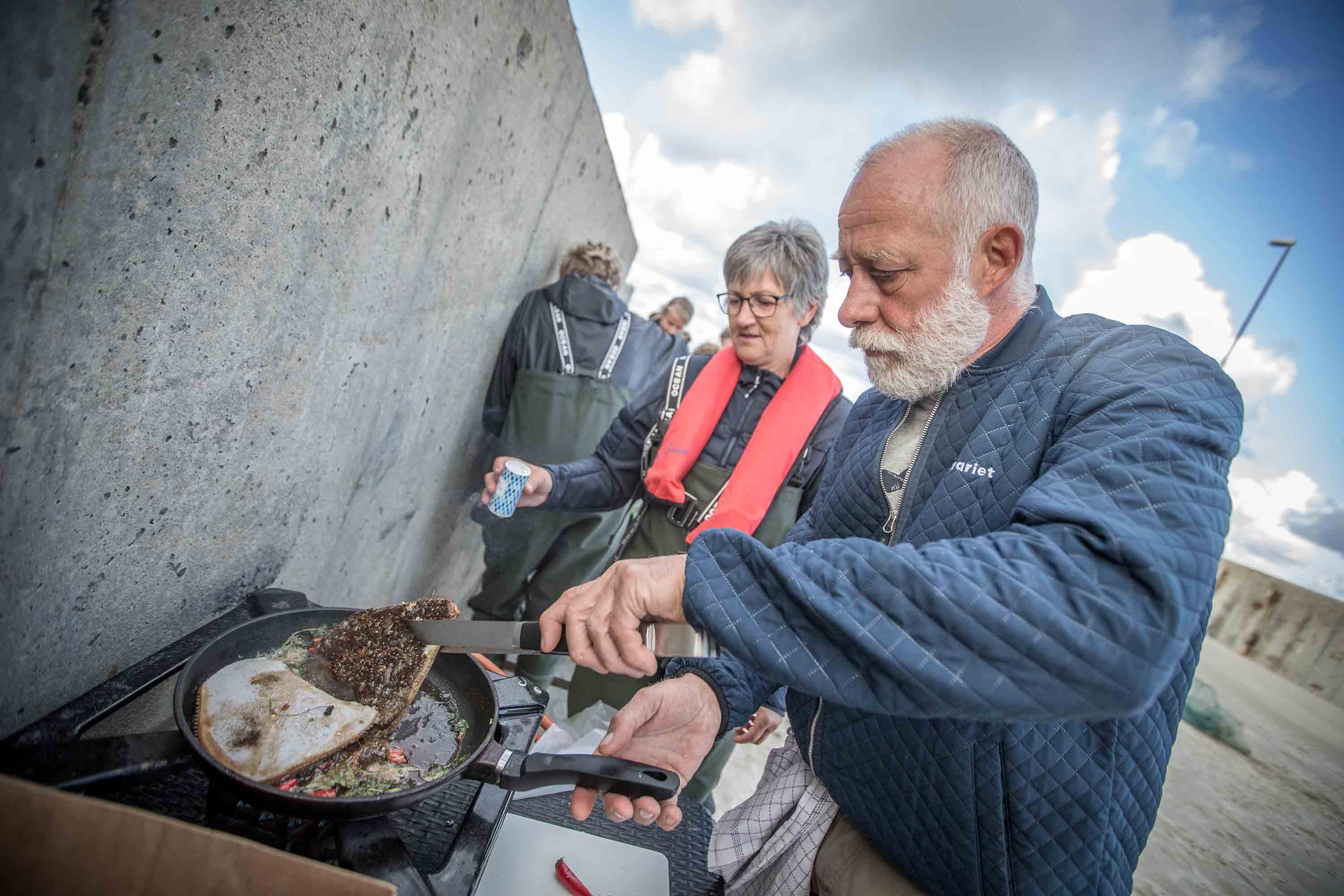 Hun viser deltagerne, hvordan de flækker en musling og sætter på fiskestangens tøjklemme, og hvordan de kan bruge et strygenet til rejer, og der er hurtigt bid. Særligt krabberne bidder i dag, og snart er der næsten halvfulde spande rundt omkring. De modige tager krabberne op med fingrene, de mere forsigtige med net.