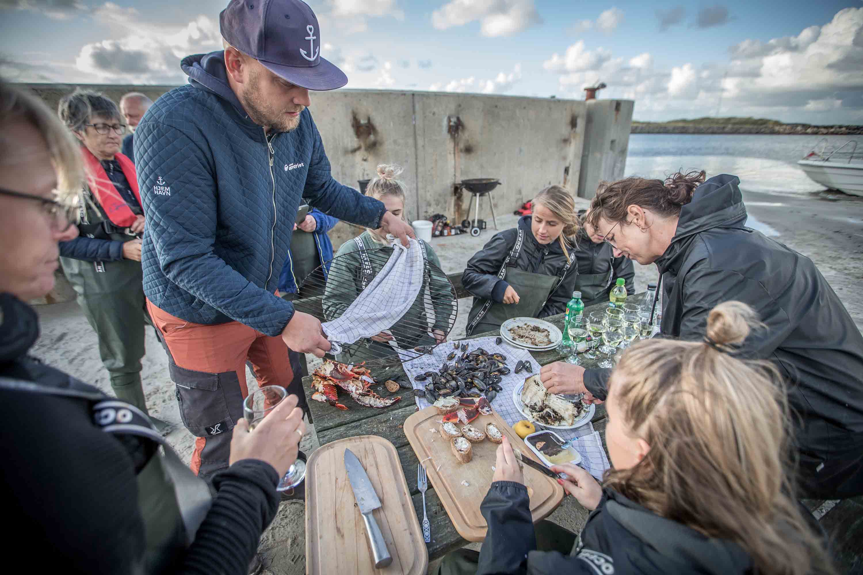 De, der ikke har appetit på rejerne, får mulighed for at smage andre ting i dag. Naturguiden har nemlig været på jagt blandt planterne omkring fjorden. Hun har blandt andet samlet havtorn og fortæller gæsterne om bærrene: Hvor de findes, og hvad man kan bruge dem til.