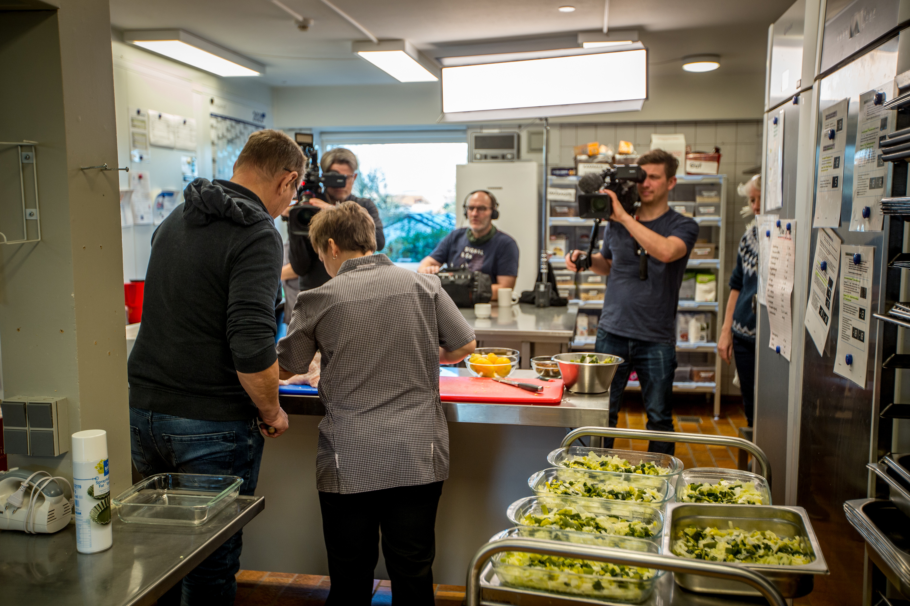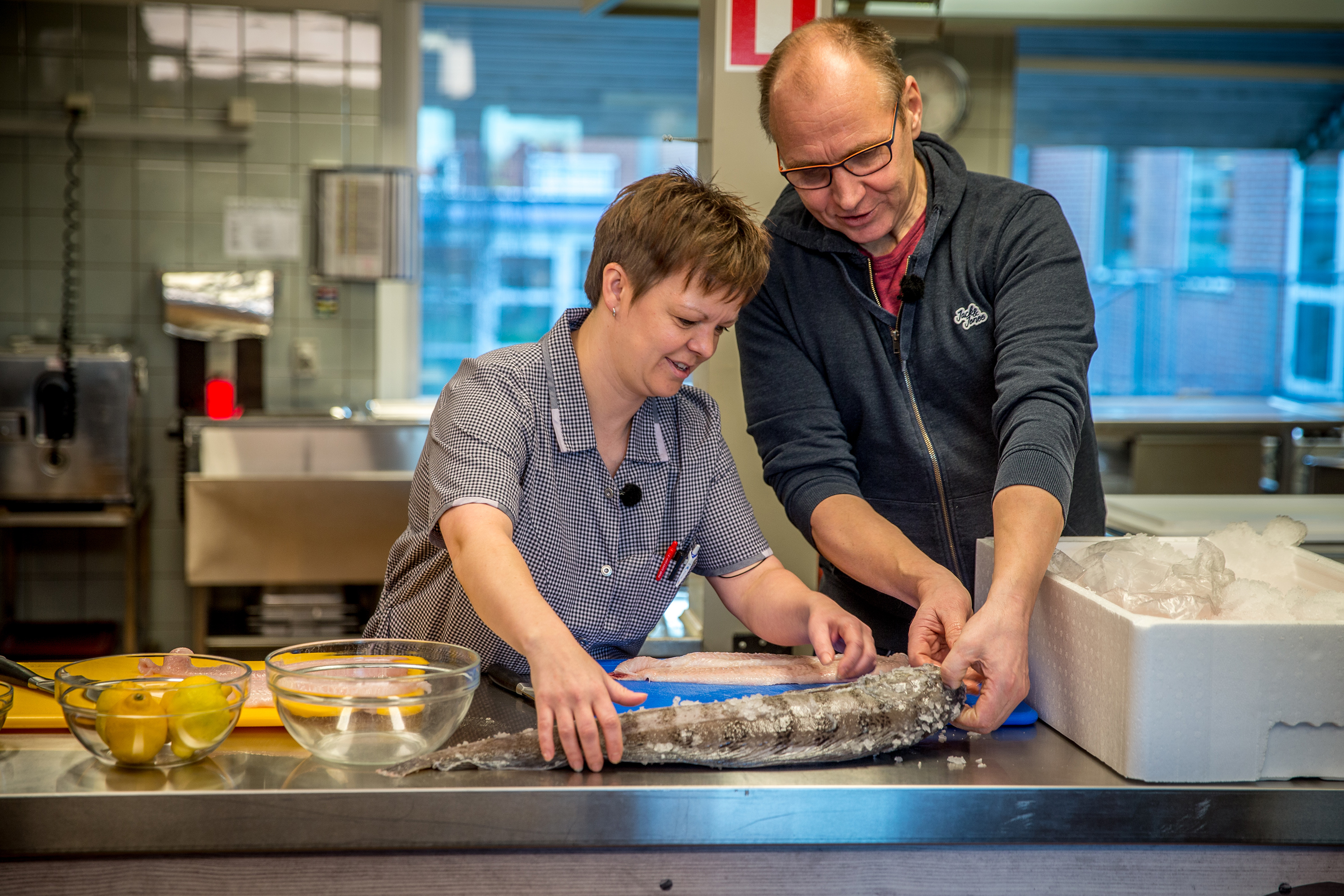 Et tv-hold fulgte nemlig hele processen fra køkken til spisebordene i plejehjemmets café, hvor en fiskeskipper fra Hvide Sande i dagens anledning spiste med og præsenterede beboerne en hel, friskfanget havkat. Fiskeren Kurt Adsersen var også med til tilberedningen, hvor han fortalte køkkenpersonalet om den sæsonaktuelle fiskeart.