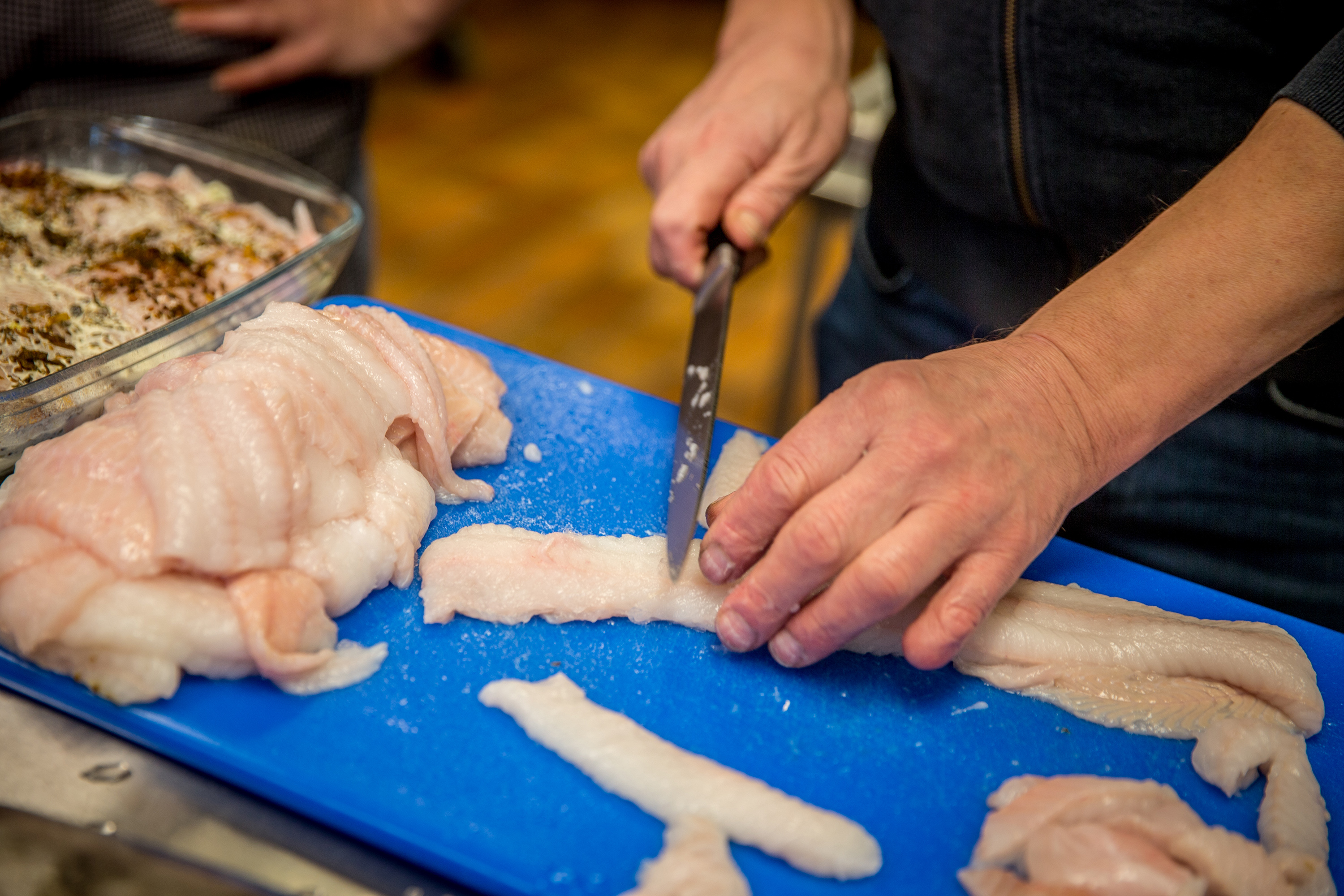 ”Det er en grim karl at se på, og den har nogle meget skarpe tænder, som den bruger til at knuse muslinger med. Så fanger du en sprællevende havkat, så bider den altså hårdt, hvis du ikke passer på dine fingre. Dét gør man kun én gang. Men ellers er den meget velsmagende og har en lidt anden smag end torsk og mørksej”, sagde Kurt Adsersen, mens han erfarent skar portionsstykker ud af havkat-fileterne.