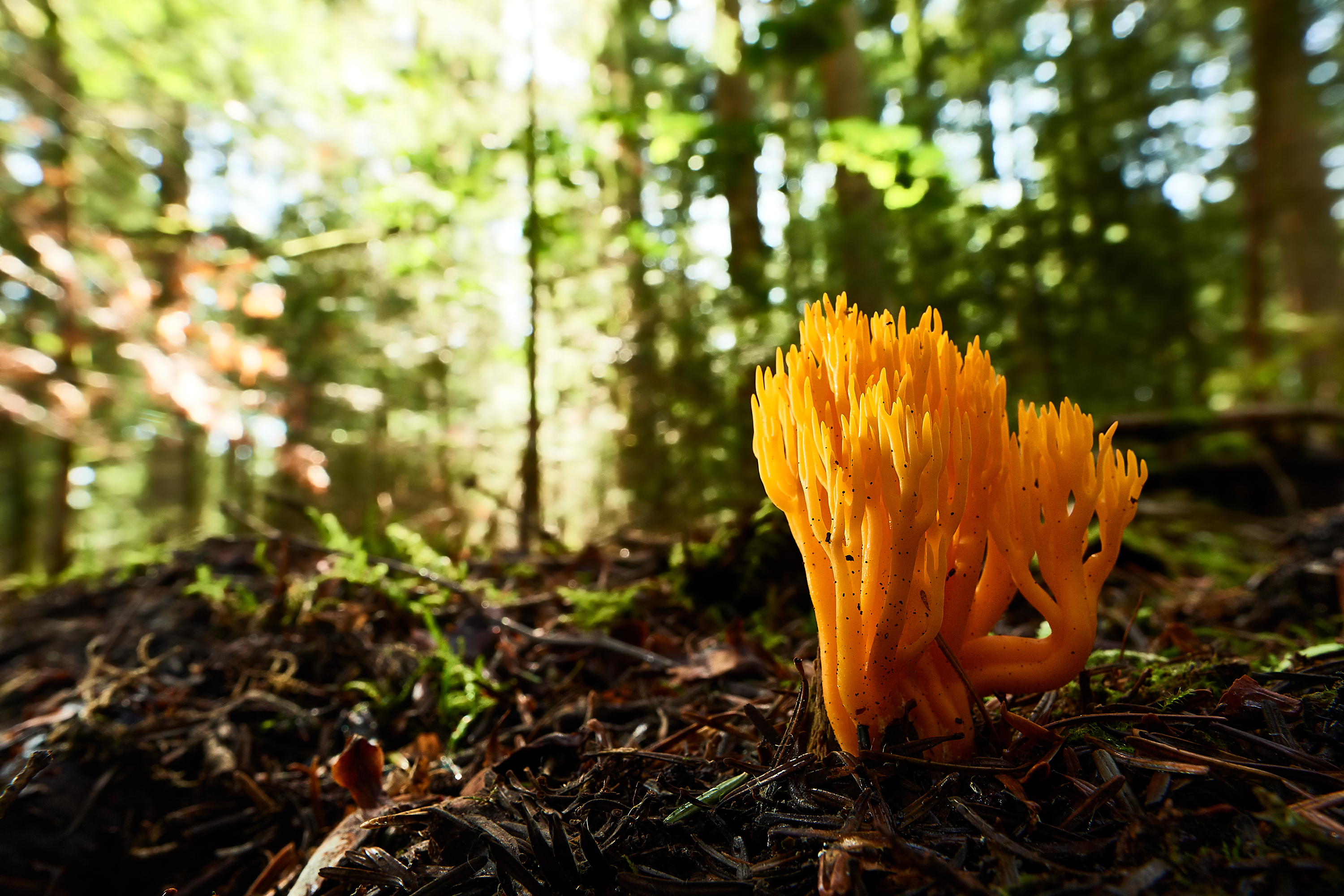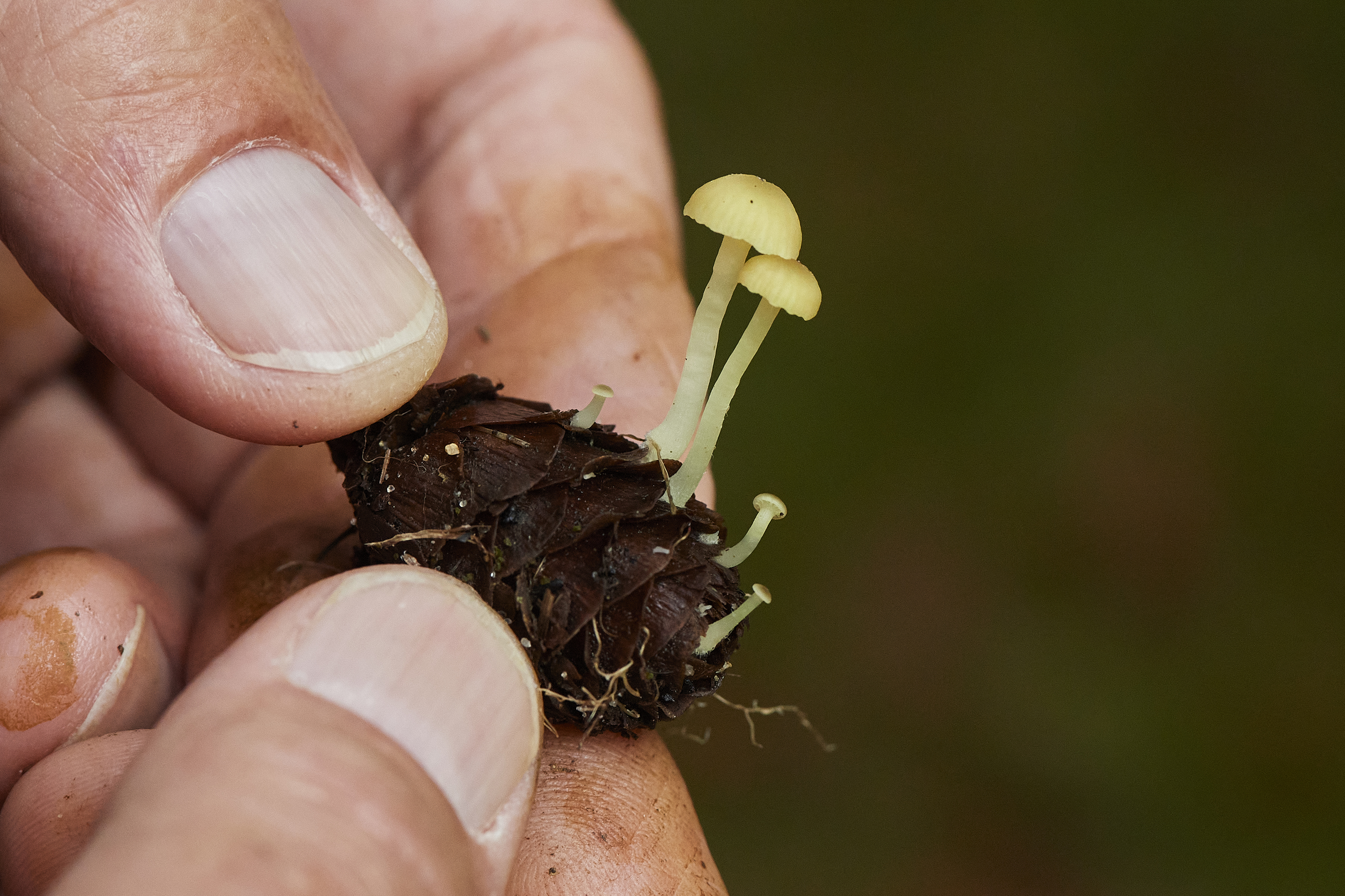 "Nej se", han holder en lille nedfalden lærkekogle op, og på den vokser der bittesmå, gule svampe. Et perfekt, men lillebitte, økosystem.