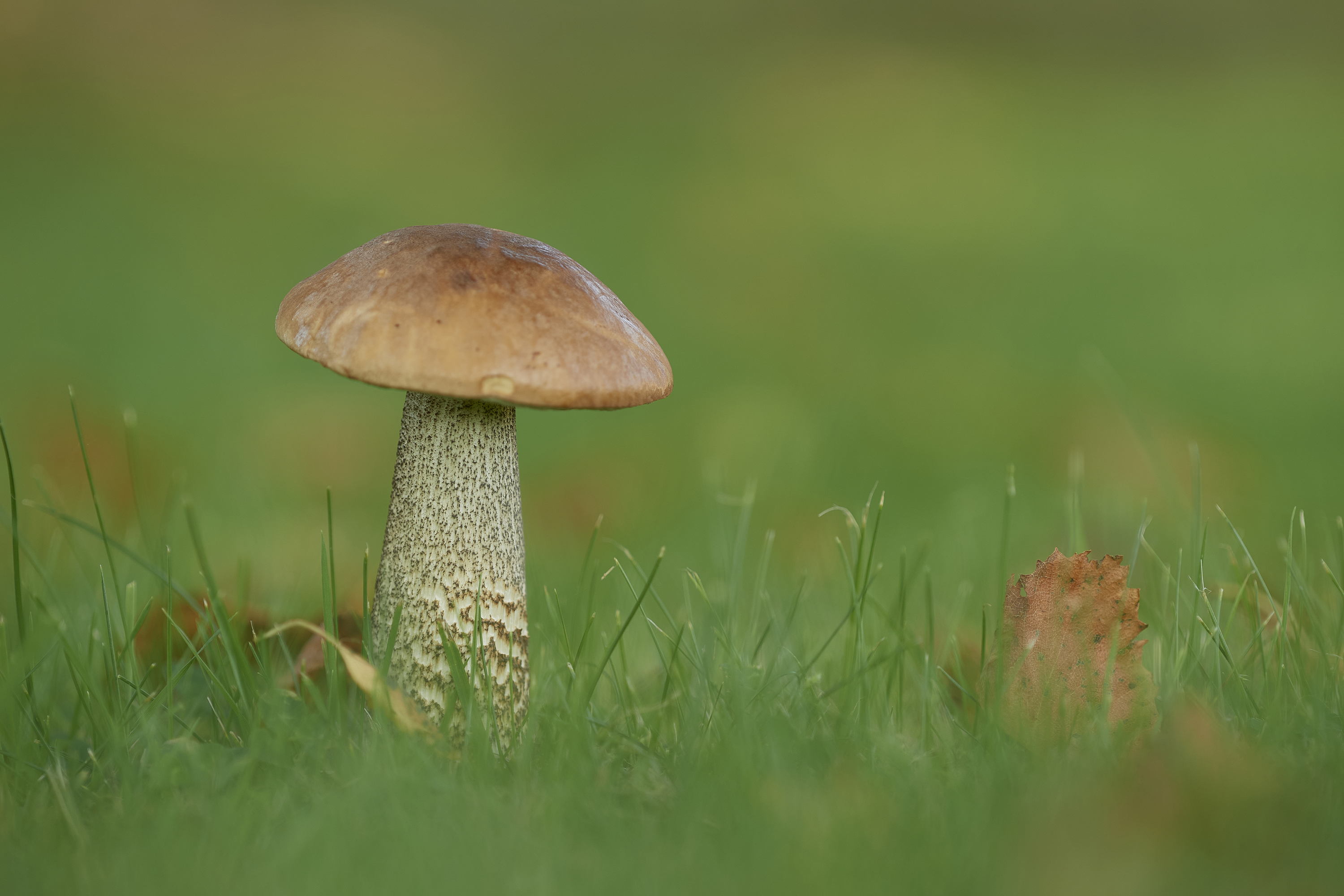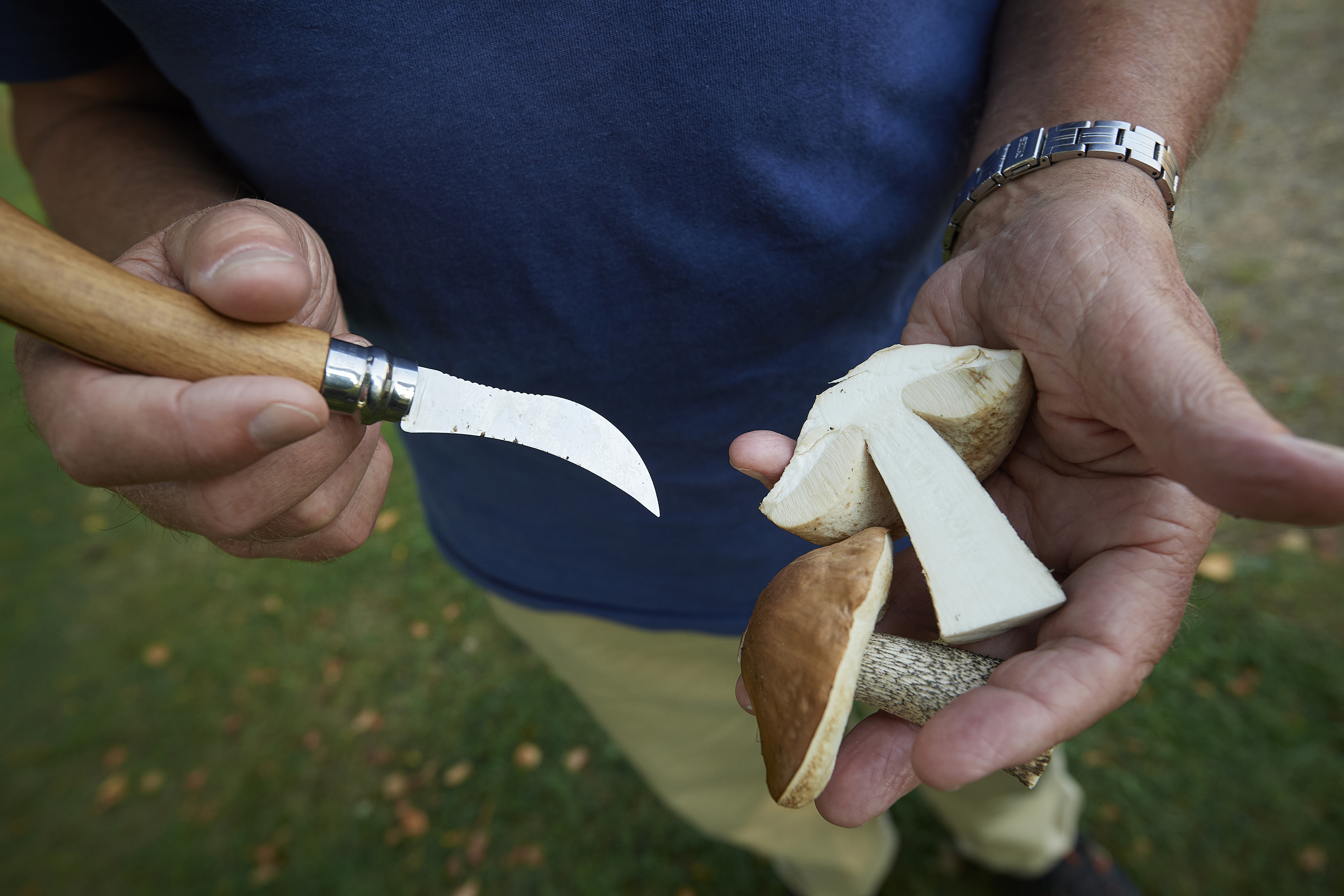 Allerede næsten inden turen er startet, er der gevinst. En smuk brun svamp lyser op i græsset midt i en efterårssolstråle. Den hedder brun skælrørhat, og Tage Madsen tager sit uundværlige værktøj frem: Svampekniven. Nænsomt skærer han svampen fri og vender den om, hvor undersiden afslører en fast flade af lyst ’svampekød’ med huller i.