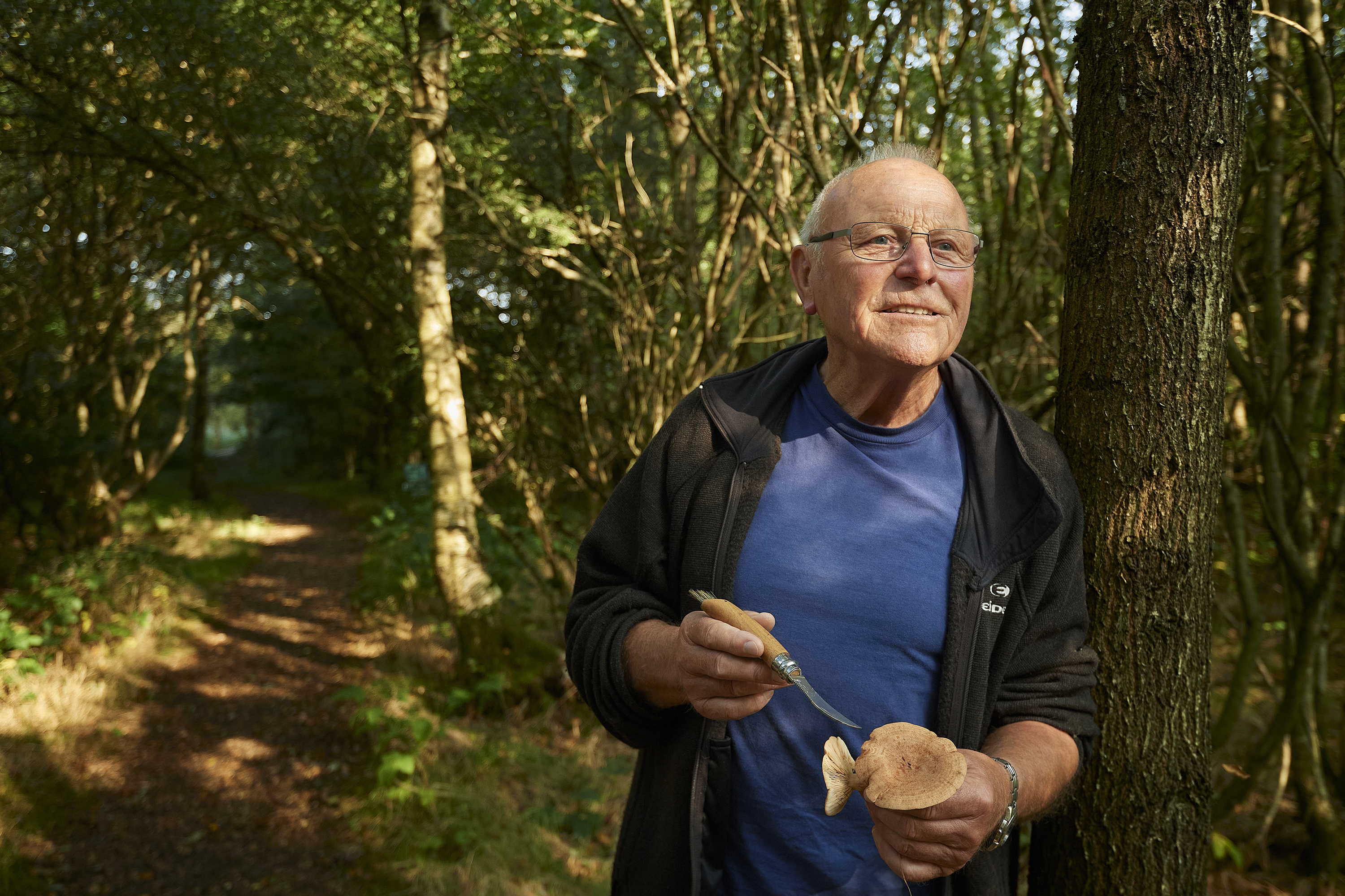 Ved Dejbjerg Plantage er Tage Madsen klar til en tur ud i svampeland. Det har han prøvet hundredevis af gange, for han har været naturvejleder ved Ringkøbing-Skjern Museum i mange år. Nu er han pensioneret, men han er stadig formand og medstifter af ’Æ Skurrehat’, der er den lokale afdeling af Svampeforeningen.