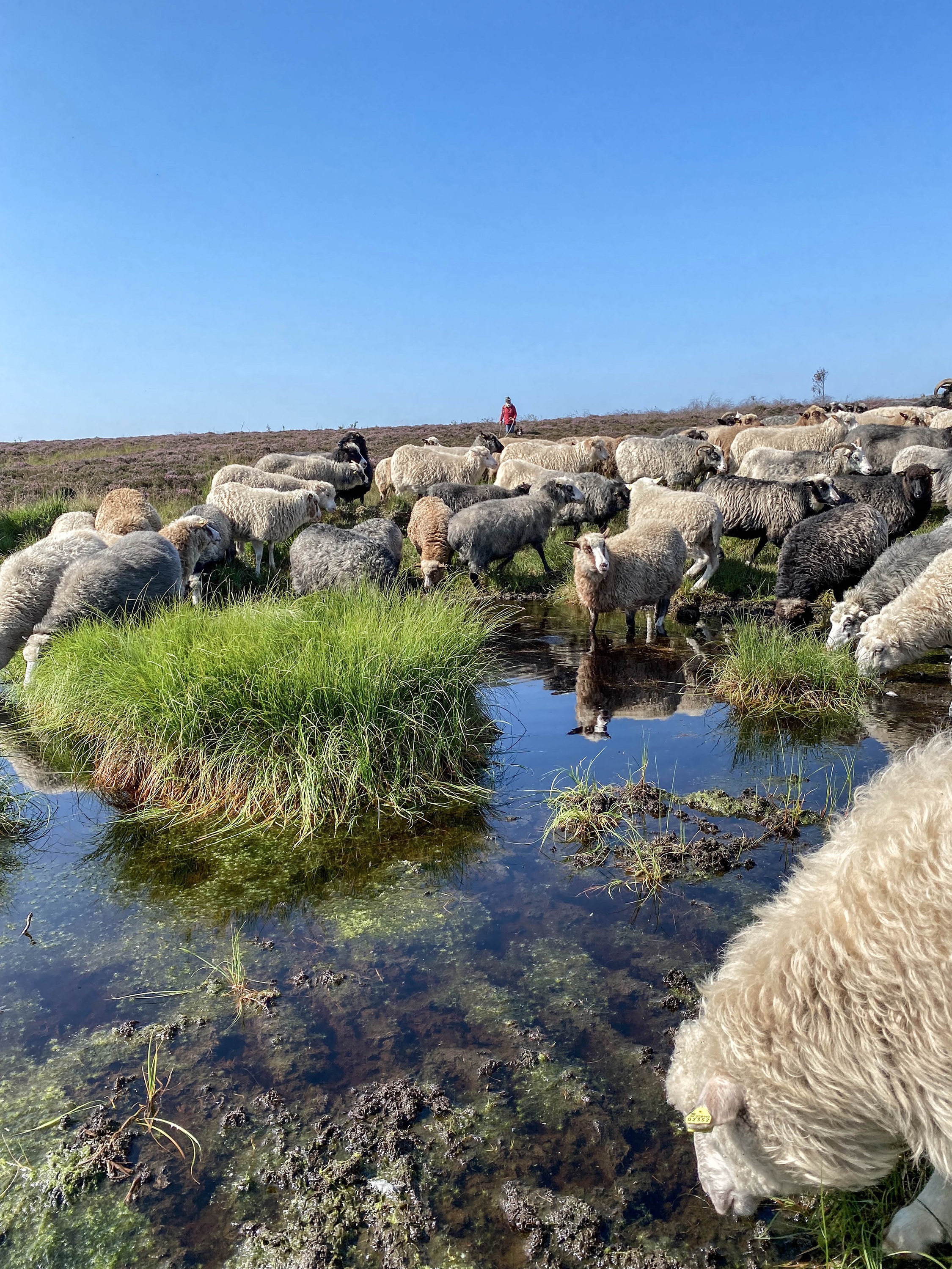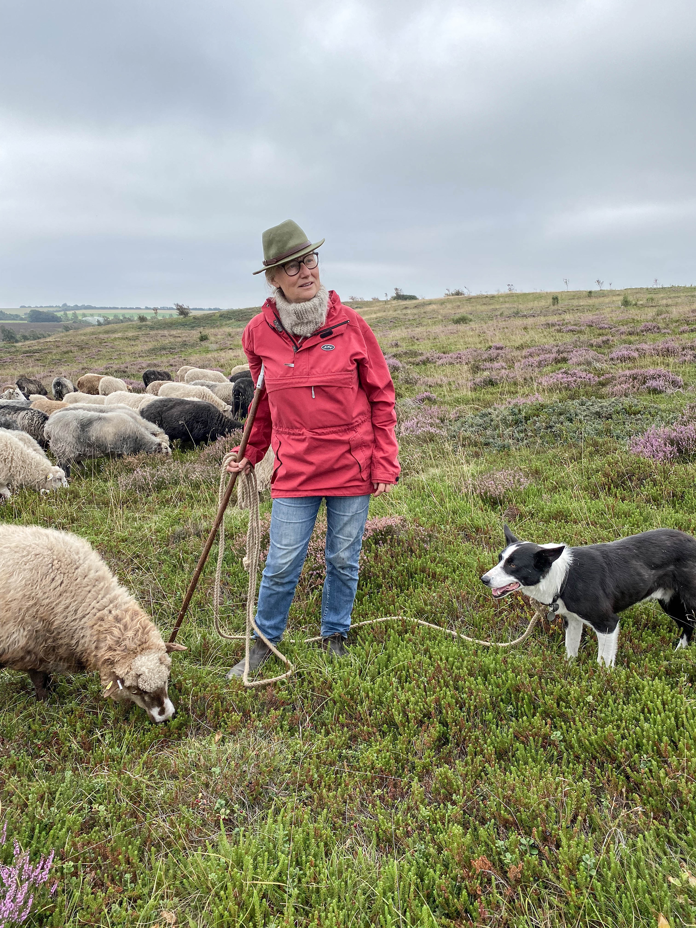 Annette Holmenlund hyrder fårene rundt på heden efter naturens behov og sætter sine mobile hegn, så gæster altid kan benytte stierne. Nogle steder vandrer hun med fårene uden hegn og har i stedet hyrdehundene Tess og Nate med til at holde dyrene væk fra nabomarker og truede planter.