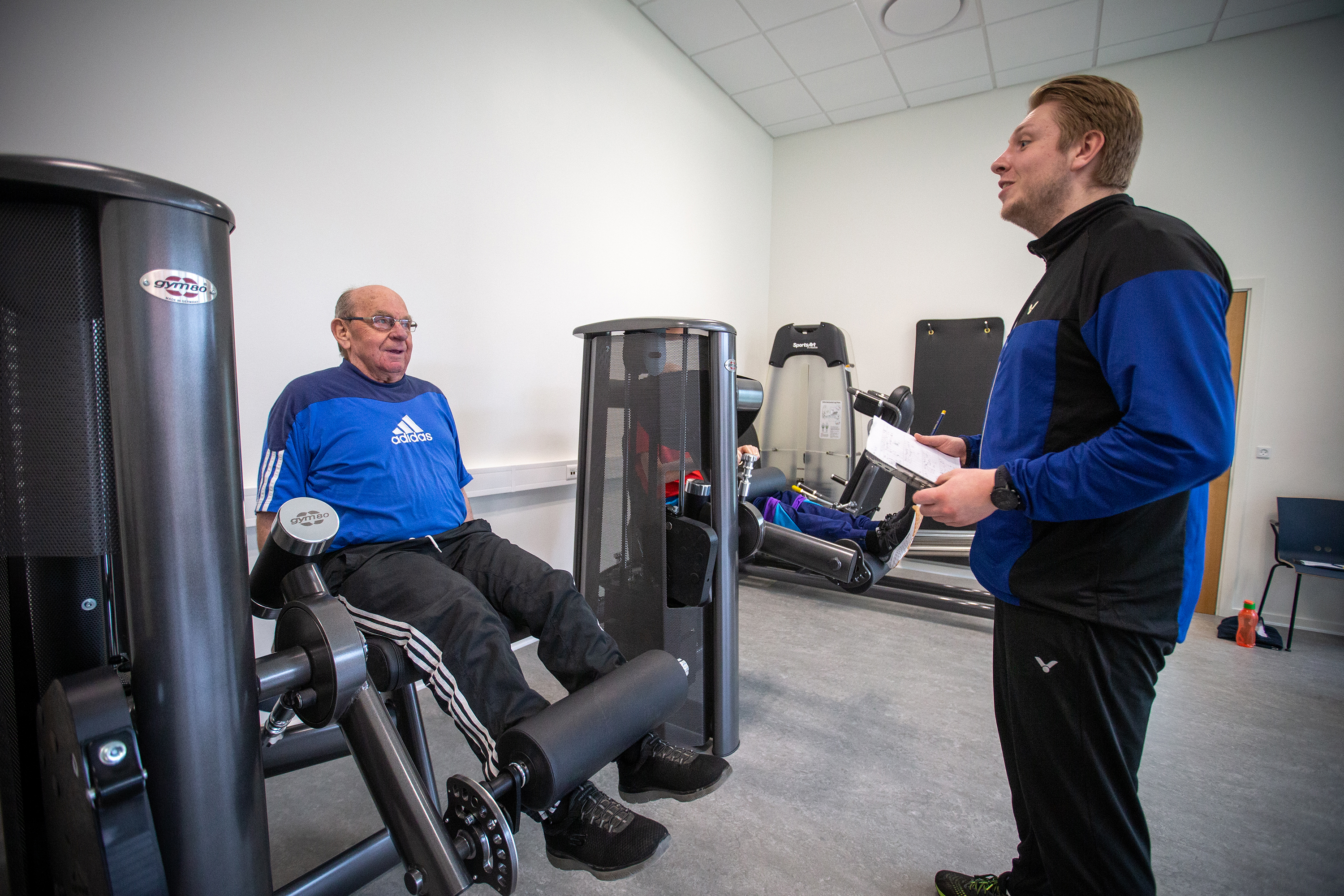Han kender sundhedshuset godt, for han er i gang med sit andet træningsforløb. Han er i dag pensioneret pedel, servicemedarbejder som det hedder, og han kom i sit første forløb, mens han stadig arbejdede. Dengang fik han en ny hofte. Hans dom er klar.