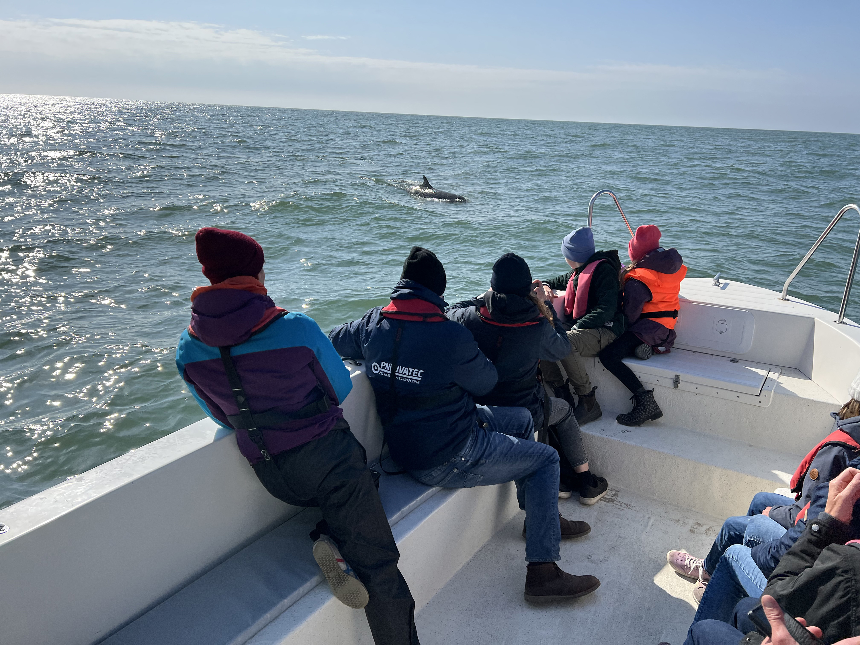 Delfinerne jager. Travlt, koncentreret og med konstant skiftende kurs. Engang imellem dukker de pludselig op så tæt ved båden, at vi kan høre deres åndedræt. Sekundet efter igen forsvundet for først at dukke op længe efter og langt, langt væk. En sild springer op i forsøget på at komme væk fra undervandsjægerne. I luftrummet jager to måger en terne, til den taber sin sildefangst. ’Der!’ ’Da!’ ’Aah!’ ’Dort; rechts!’ ’Ser du dem?’ På tværs af sprog flyver observationer mellem bådens gæster, mens arme peger i skiftende retninger. Alle vil gerne se, alle begejstres over det sete og går i land med levende øjne. Der er noget ved delfiner.