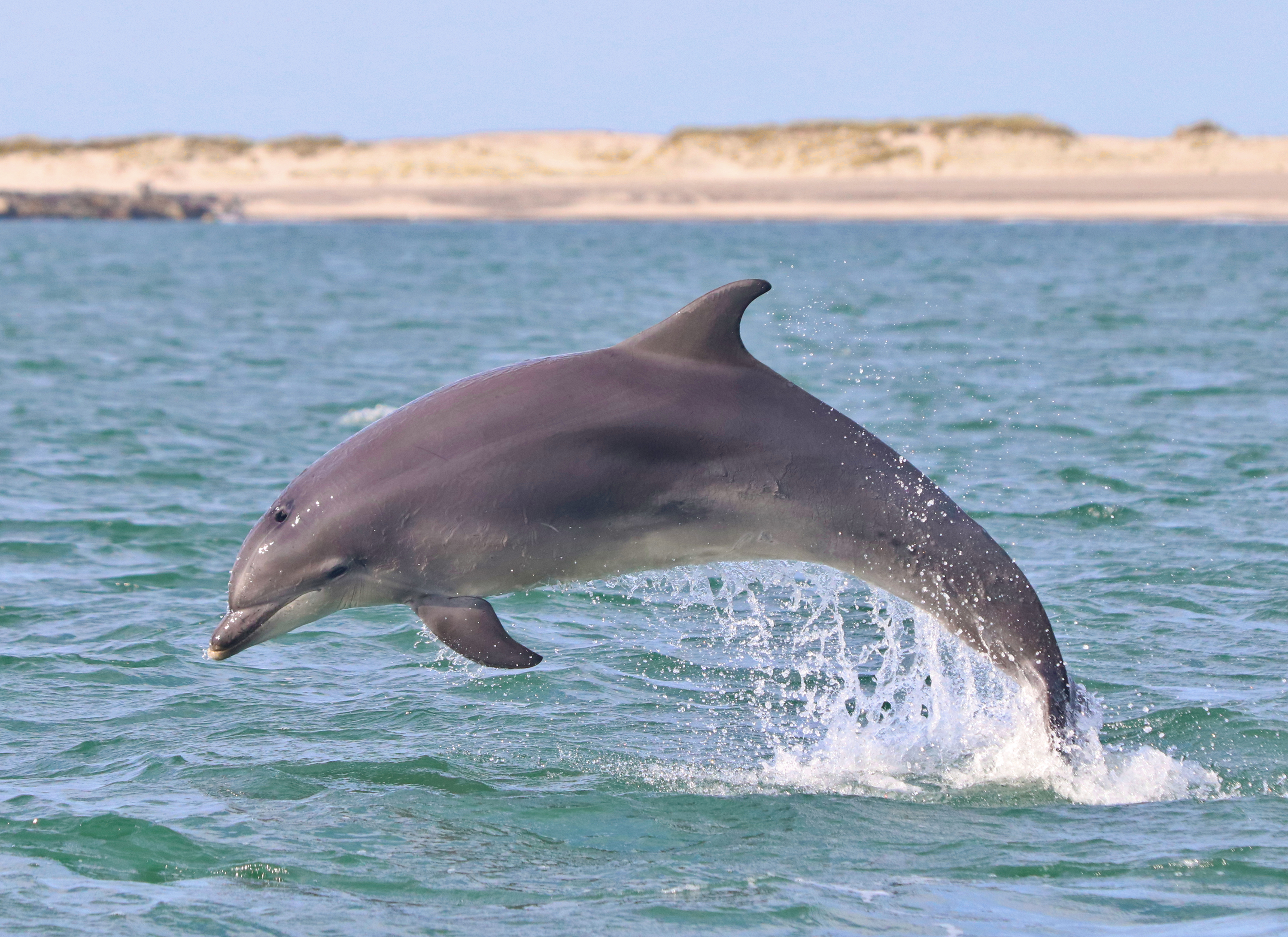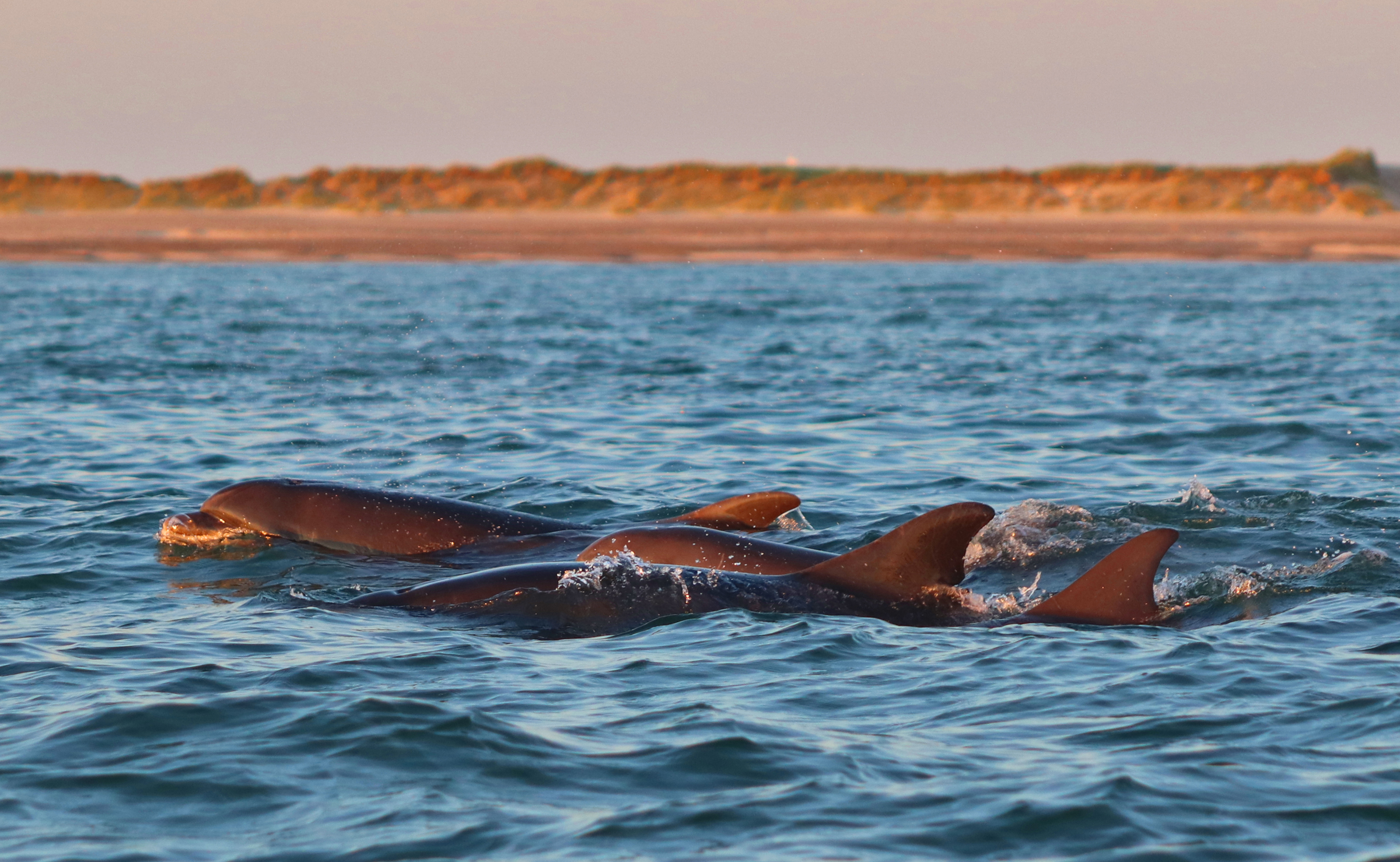 På den første tur over tunge blygrå havdønninger ser jeg dem springe. Højt. Smukt. Betagende. Det er sen eftermiddag. Deres haler klapper overfladen, sandet lyser i baggrunden på kanalens breder. Dyrene har formentlig lige spist og virker sprængfyldte af livsenergi og fryd ved at findes. De ruller rundt. Både om sig selv og svømmende så tæt side om side, at deres rygfinner minder om tapper i et velsmurt tandhjul. Det varede længe, inden vi først så dem i horisonten på vej tilbage til kanalen sydfra. De var værd at vente på. Et stykke menneskelykke at tage med i land.