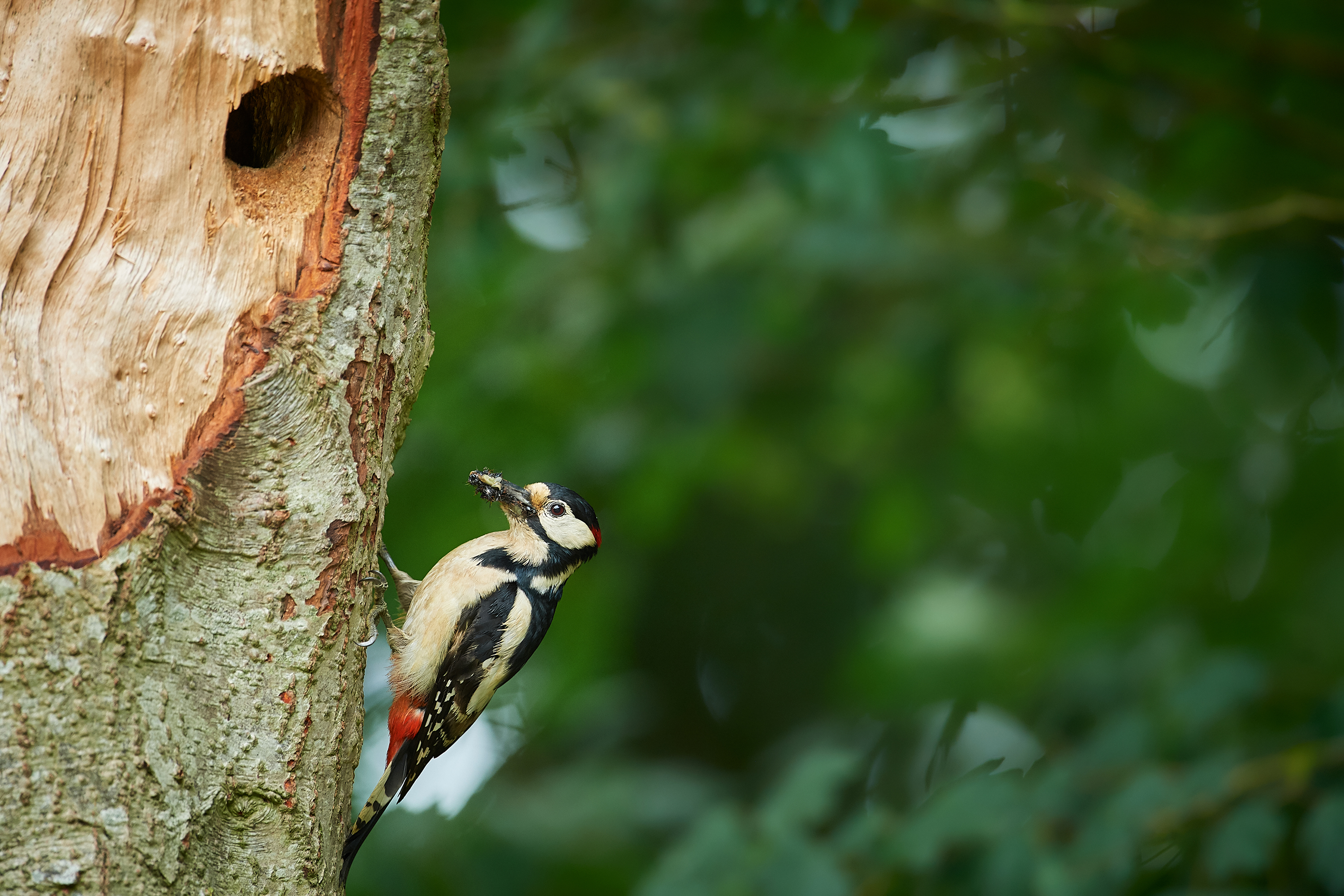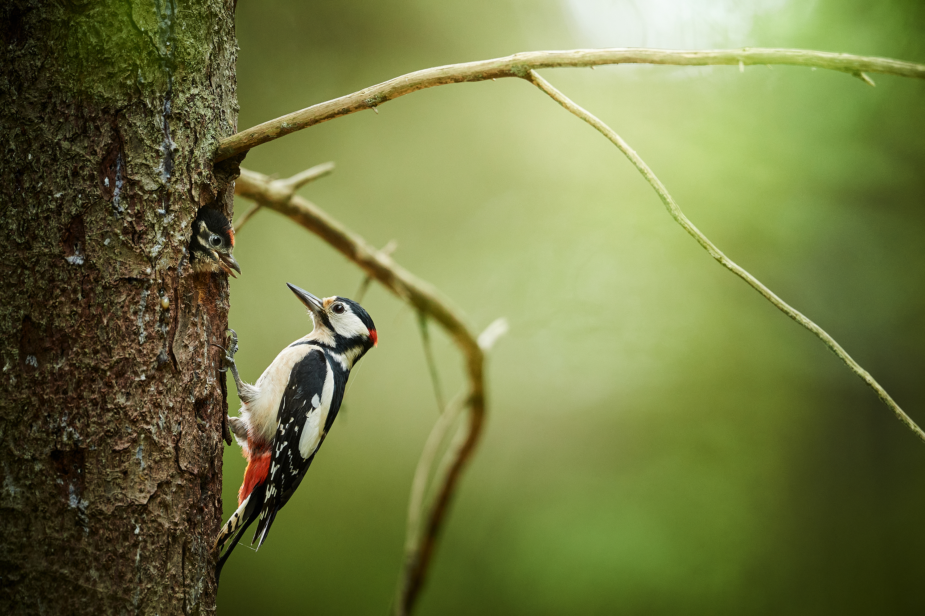 I april til juli får spætterne nemlig unger. Ungerne er i reden, der som regel findes i huller, spætten har hakket, i træstammer. Spætteunger larmer konstant, og forældrene flyver i fast rutefart med mad til dem. Hører man en larmende, konstant skræppen, så gå efter lyden, så kan man være heldig at finde redetræet. Her skal man selvfølgelig holde god afstand og ikke forstyrre eller skræmme de voksne, men så ved man, hvilket område i skoven spætterne flyver i, og så kan man være heldig at se dem her.
