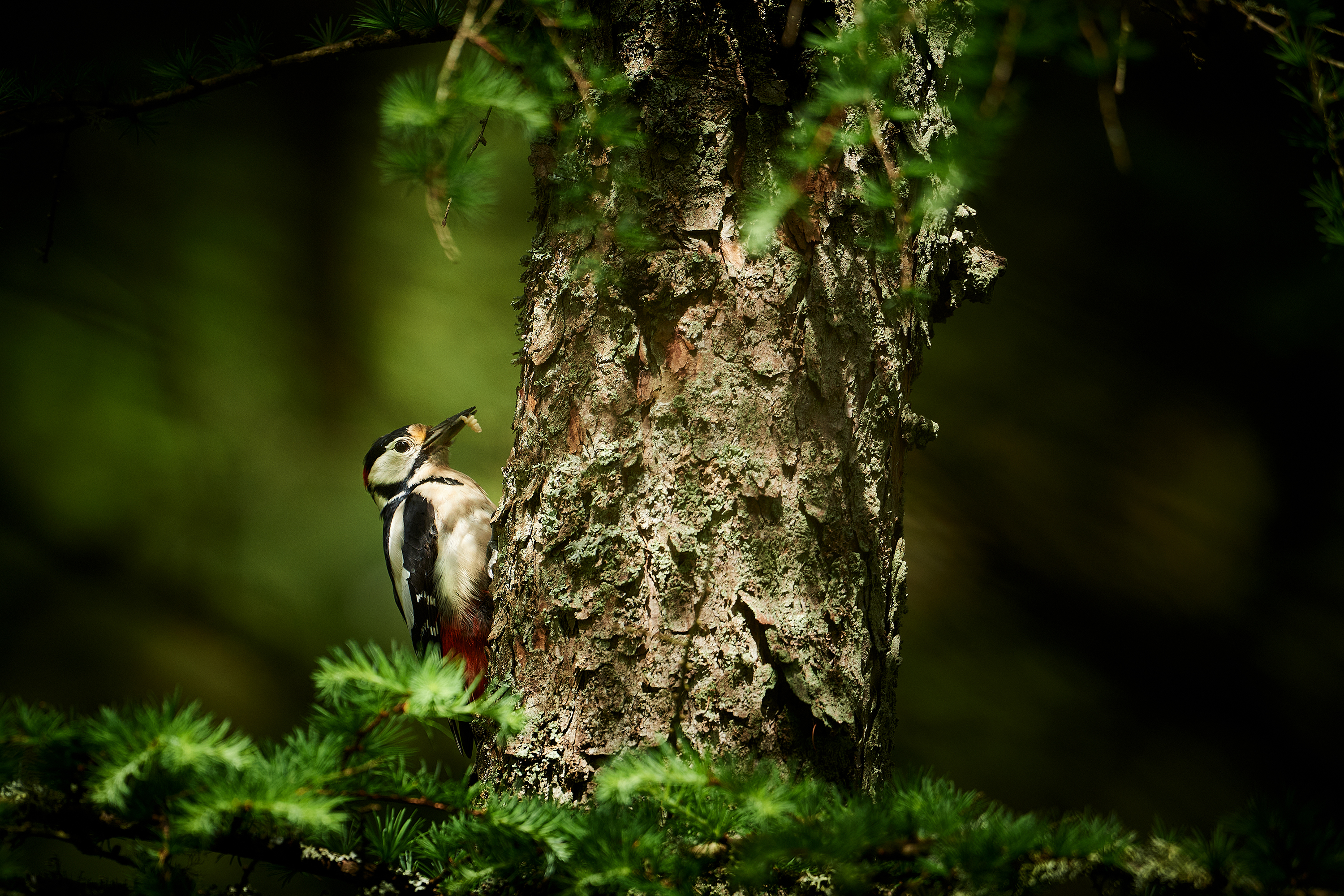 Man skal i skoven for at opleve dem, og det kan man gøre hele året, for stor flagspætte er nemlig en standfugl. Den bliver her også om vinteren.