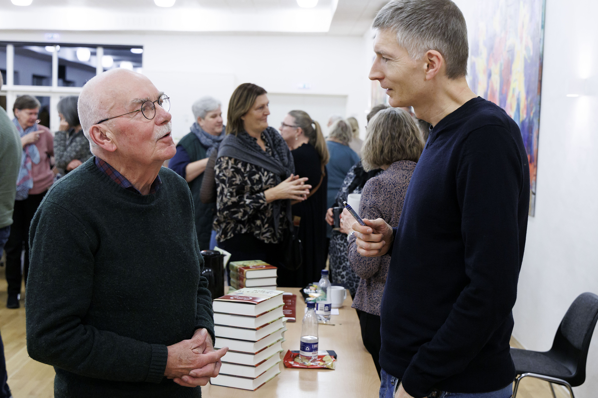 I takt med at vinglas, vand og chips sættes frem til høflig selvbetjening, finder folk på plads. Der hilses, vinkes og snakkes. Par, veninder, og mænd i flere generationer af samme familie; farfar, far og søn. Umiddelbart procentvis flere mænd end der typisk optræder i danske statistikker over læsere af skønlitteratur, omend historiske romaner har det med at udligne kønsforskellen.