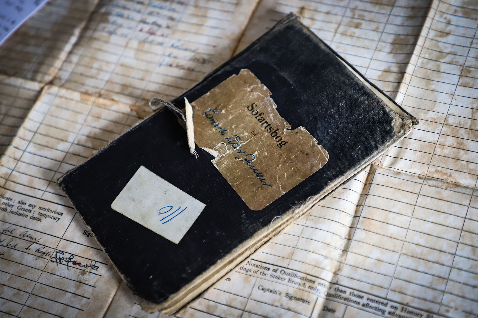 Blandt dokumenterne på køkkenbordet hos Annalis ligger der også et ”Certificate of the Service of Laurids Peter Jensen in the Royal Navy.” Dokumentet er lavet på en form for vokset, gulnet stof, hvor man kan se løse tråde trevle i kanten.