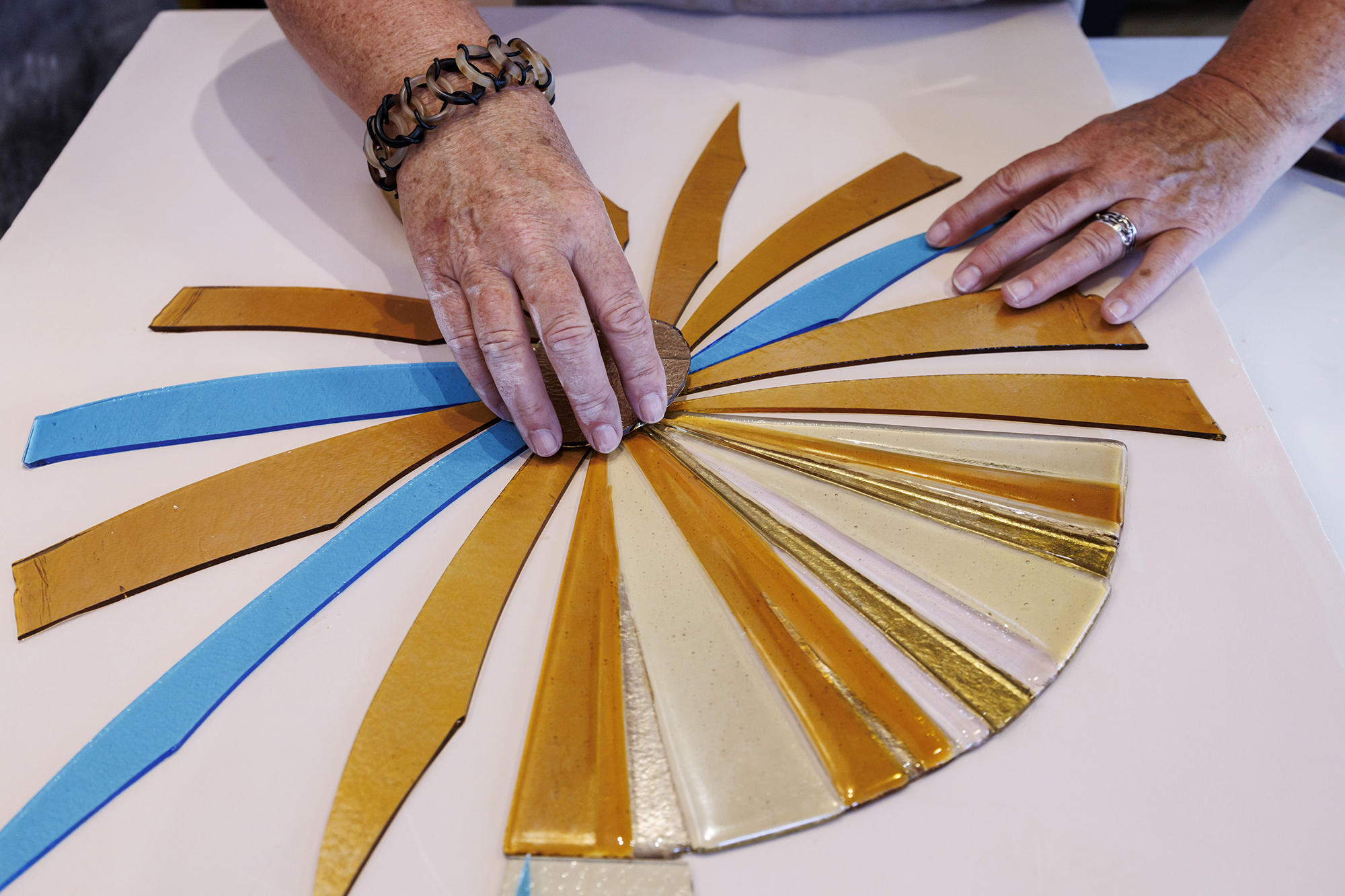 - Man kan sige, at jeg nu i 50 år har arbejdet med farve og form, men glas har nogle helt specielle egenskaber, der altid har fascineret mig. Det kan godt være, at jeg i nogle værker tilsætter andre materialer, men glas vil altid være det helt centrale i min udtryksform, pointerer Agnethe Maagaard.