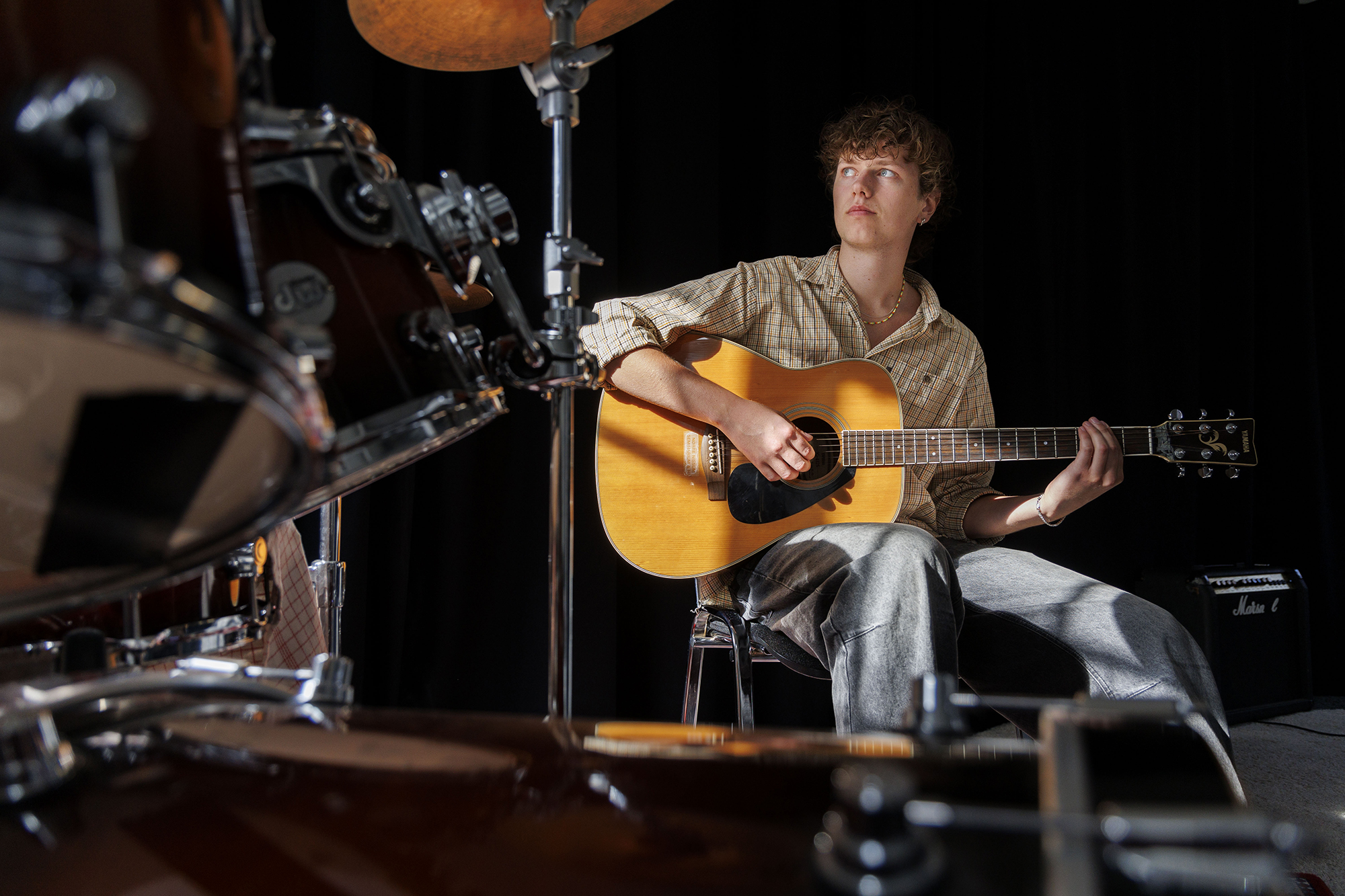 ”Jeg spiller guitar og bas, men kan godt finde på at gå i Sangsalen og spille et par akkorder fra flyglet bare for at nyde lyden”, siger Johan Skov Nees.