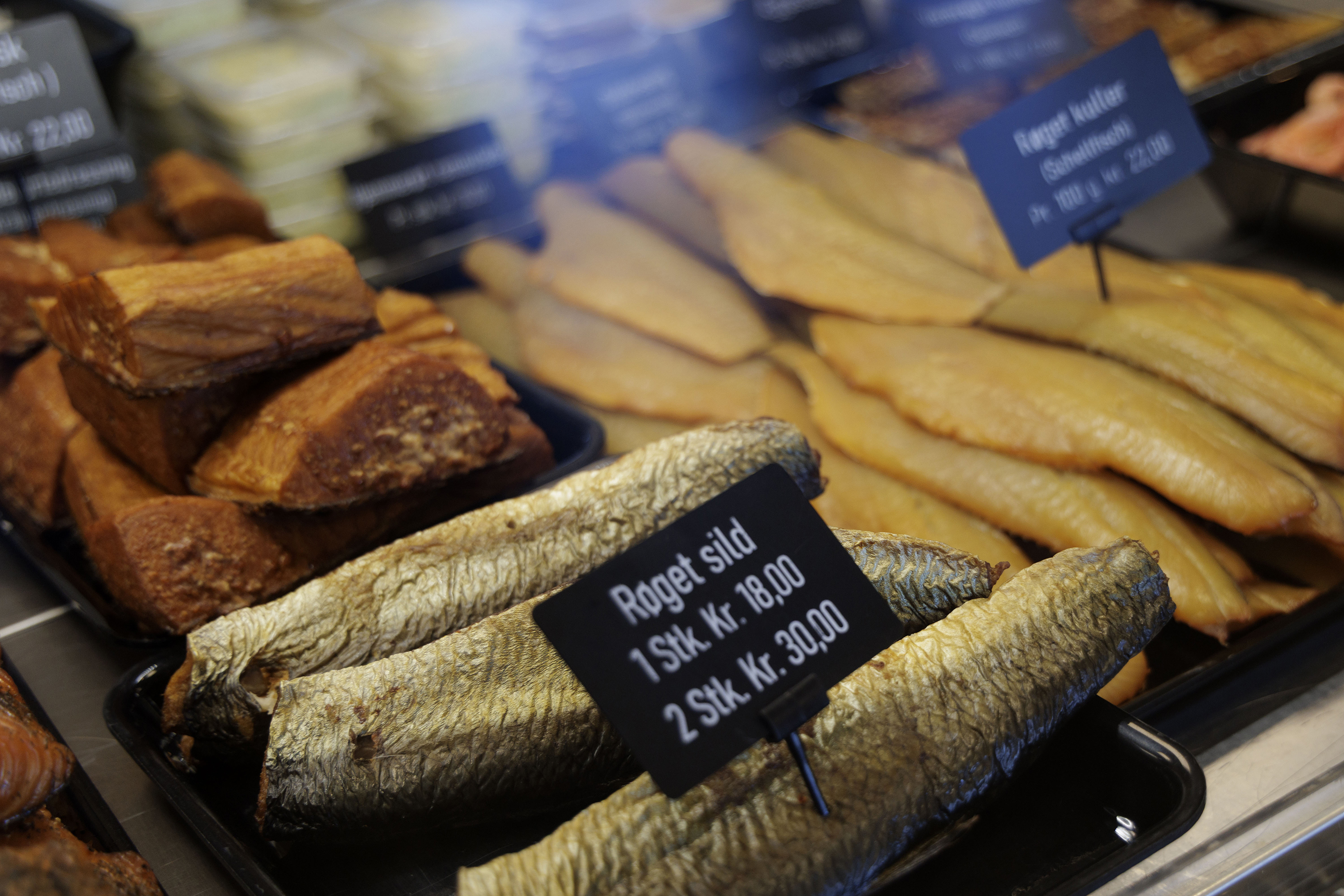 Betjeningen i den gamle, røde auktionshal er anderledes rolig. Hos fiskehandleren i Fiskehallen er der både frisk og røget fisk, skaldyr og hjemmelavede specialiteter at vælge mellem. Mod bestilling kan fisken pakkes - eventuelt fryses ind -, så den kommer godt med hjem fra besøget på Vestkysten.