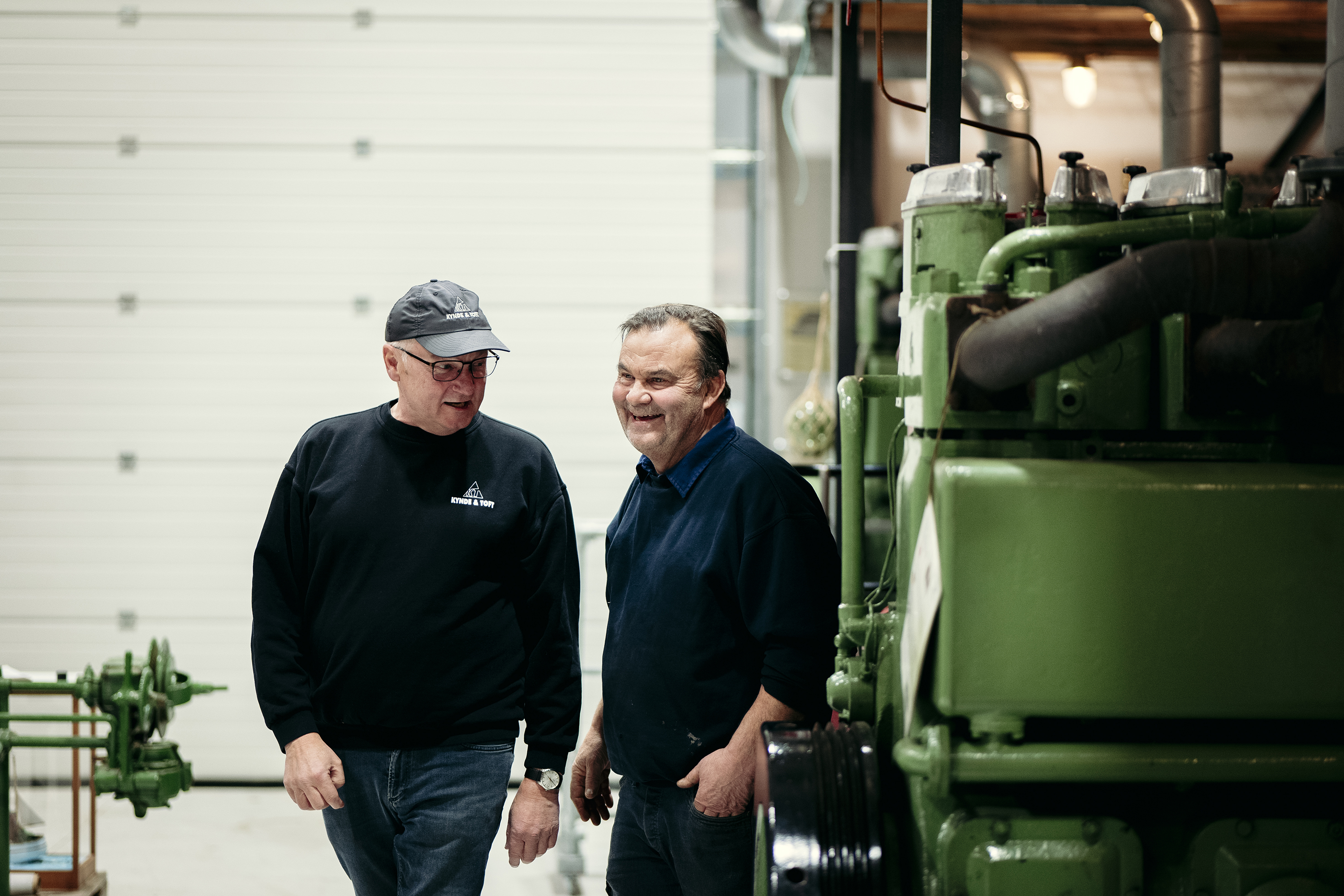 Og sådan er tonen. Kontant og kærlig. Når man da kan høre, hvad der bliver sagt, for pludselig hvisler det højt med trykluft, og en motor dunker langsomt i gang. Det er J.O. Mortensen som netop har startet en B&W Alpha fra 1954, og nu holder øje med omdrejningerne og giver den gas, så det lyse værkstedsgulv vibrerer.