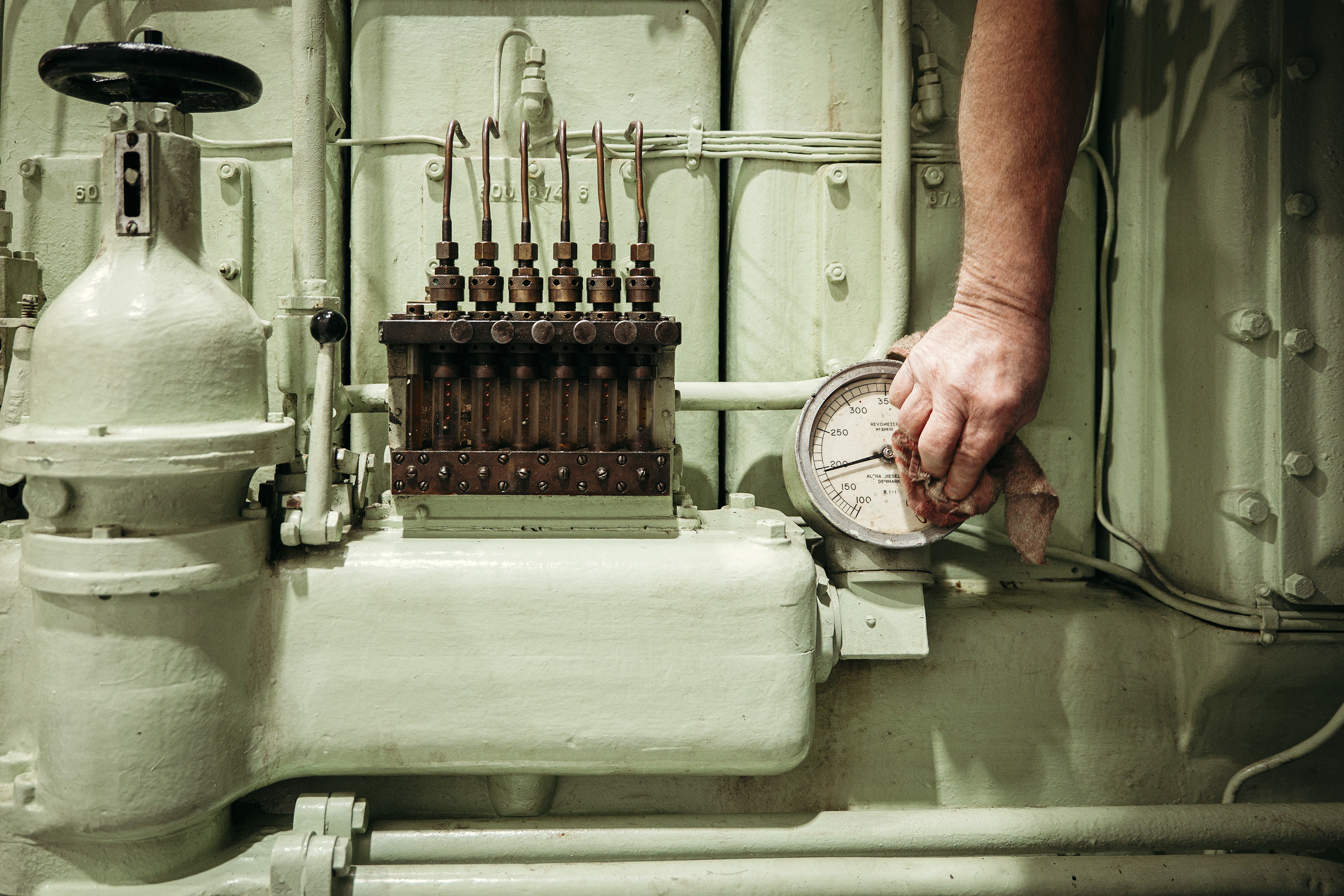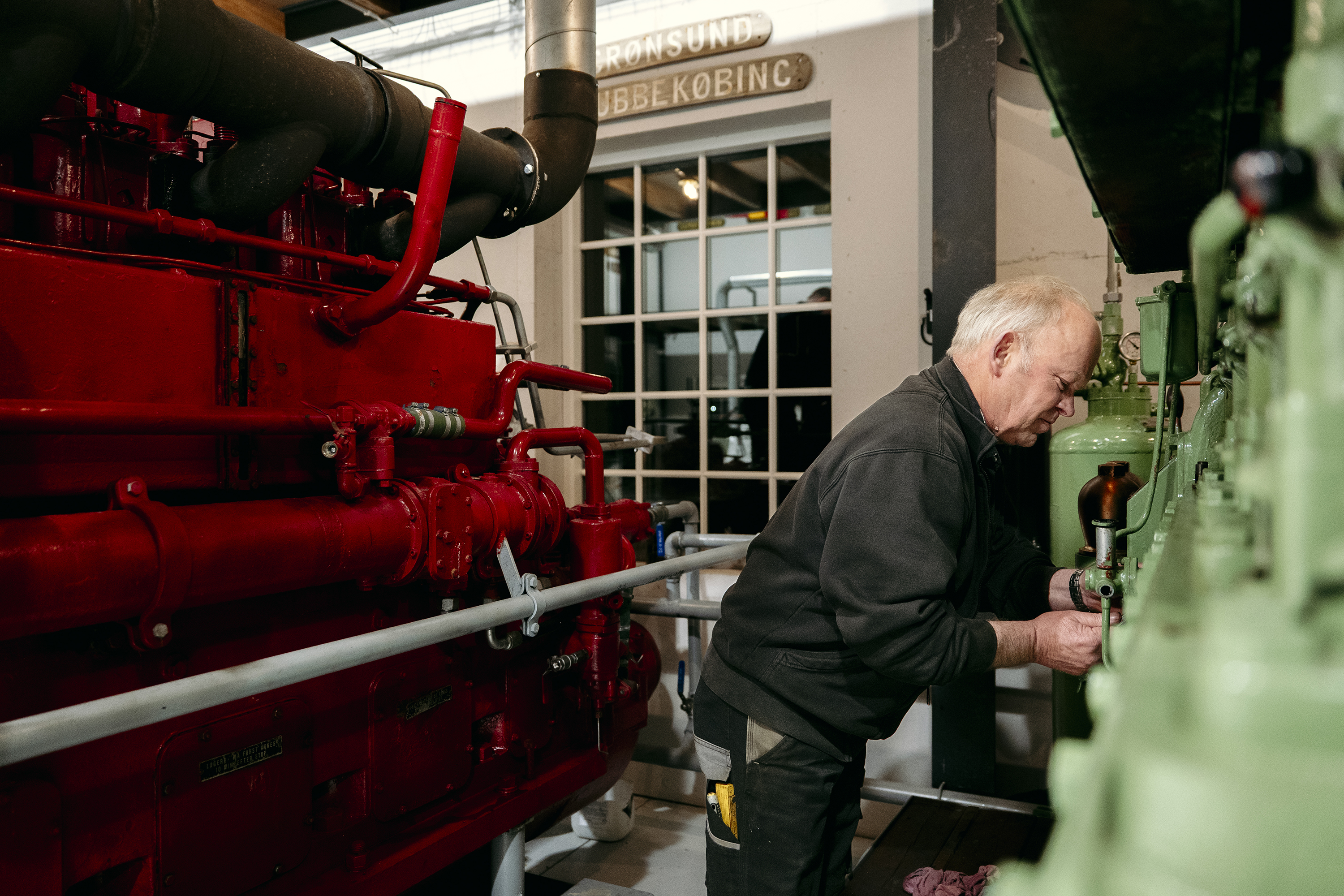 For selv om den lysegrønne motor kører som smurt, skal de gamle maskiner hele tiden vedligeholdes og justeres. Akkurat som dengang, de lå i bugen på en kutter eller en slæbebåd.