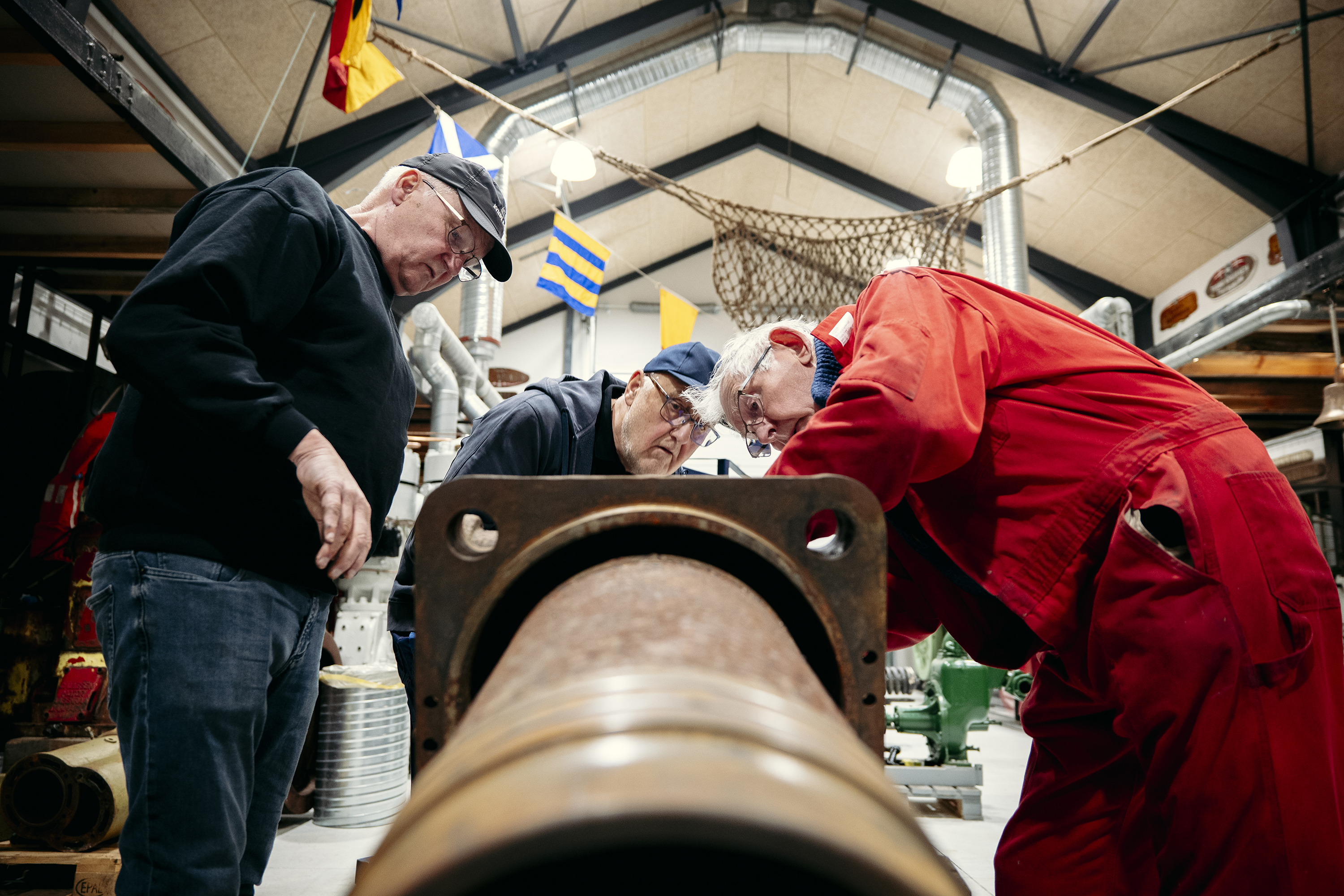 Eller i en sandpumper, som den kæmpestore, anløbne B&W-motor, ”Æ’ Motorrum” har fået foræret, og som en gruppe nu er i gang med at restaurere i den anden ende af hallen.