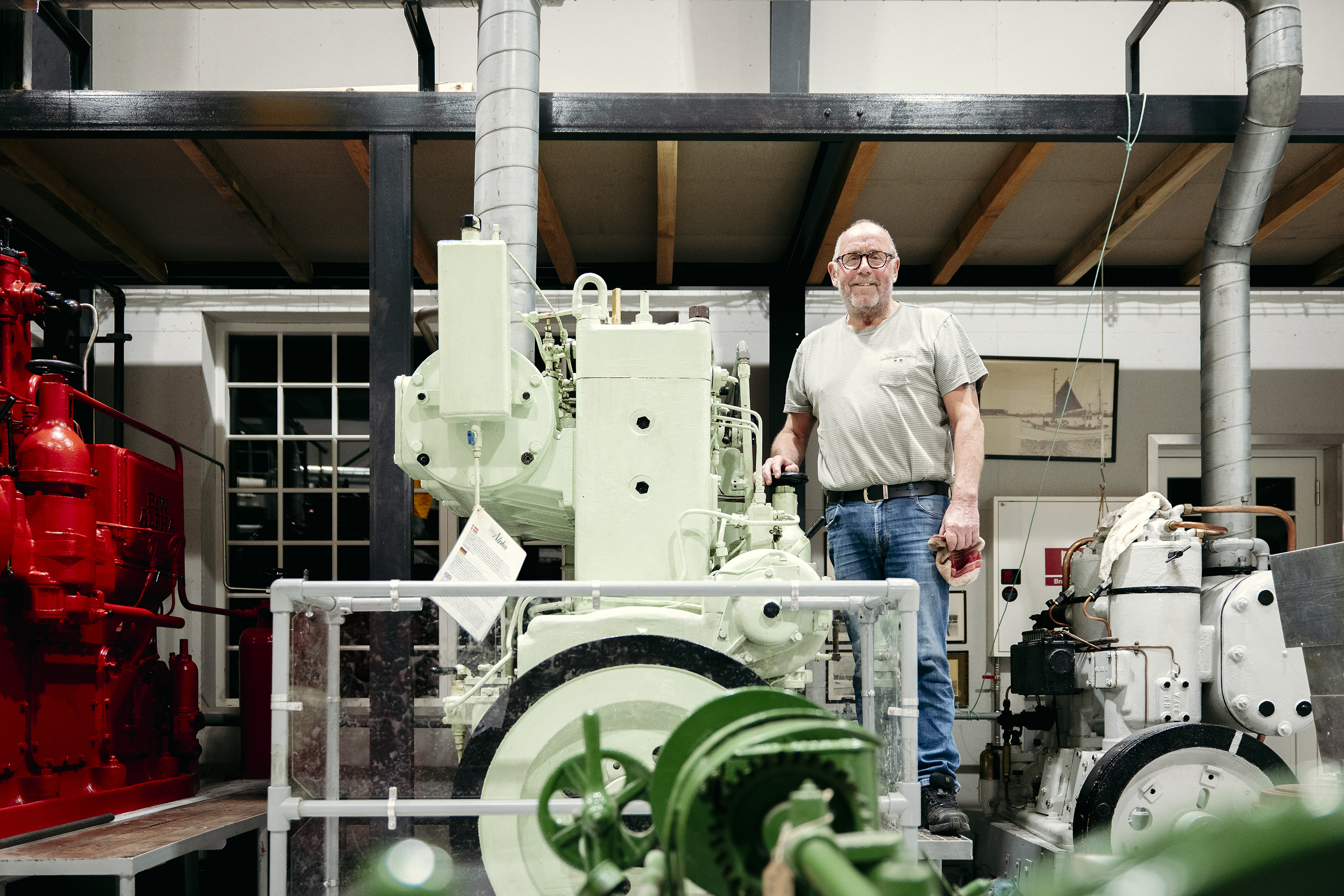 ”Når man er ung skibsmontør, er der en vis charme ved at ligge nede og arbejde i et trangt motorrum og bære alt op derfra med håndkraft. Dengang havde vi jo ingen kraner. Men nu som pensionist er det rart at gå rundt her med god arbejdshøjde og godt lys,” siger J.O., som har været ansat og medejer hos Thyborøn Skibs & Motor i 50 år, og har været frivillig i ”Æ’ Motorrum” i halvandet år.