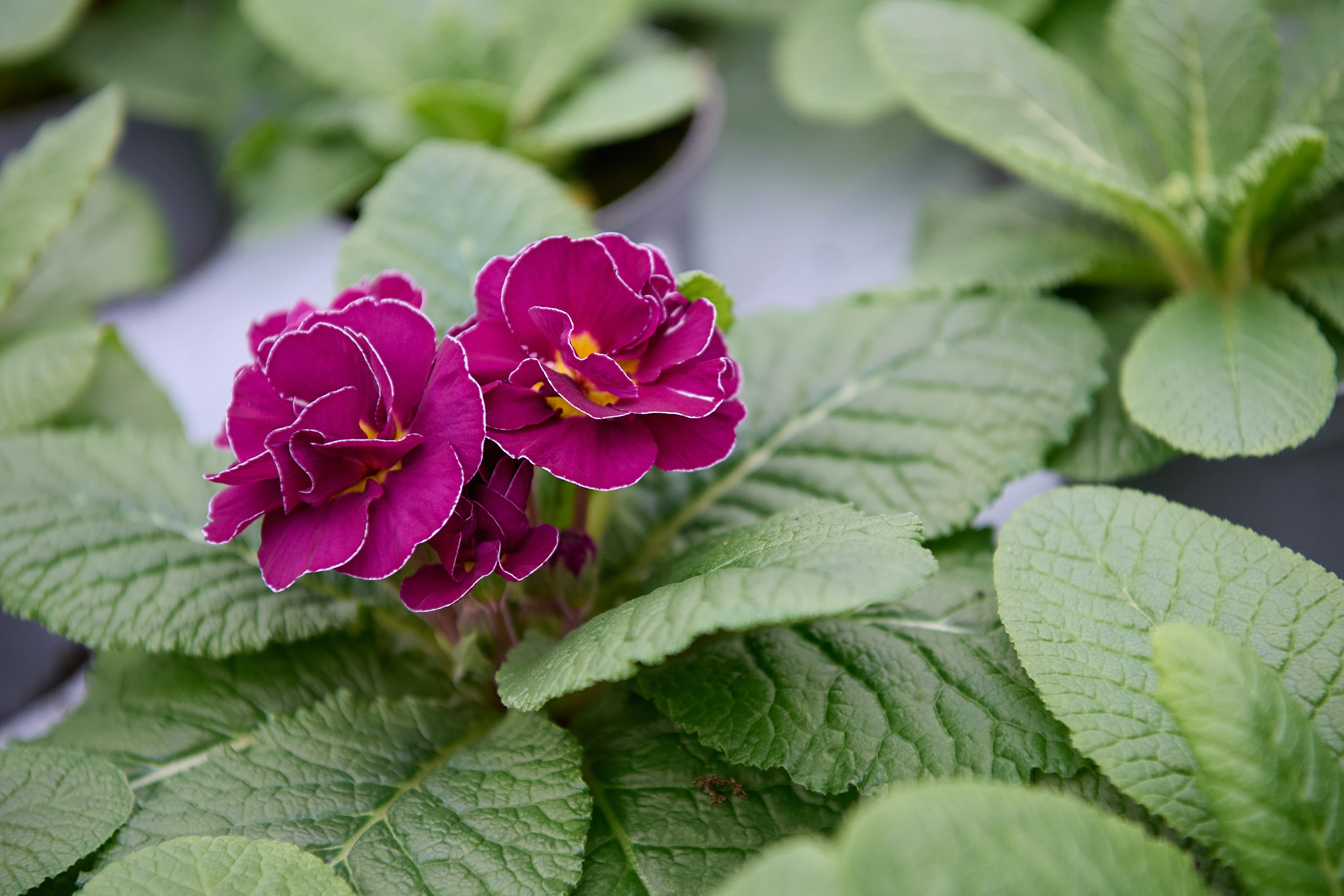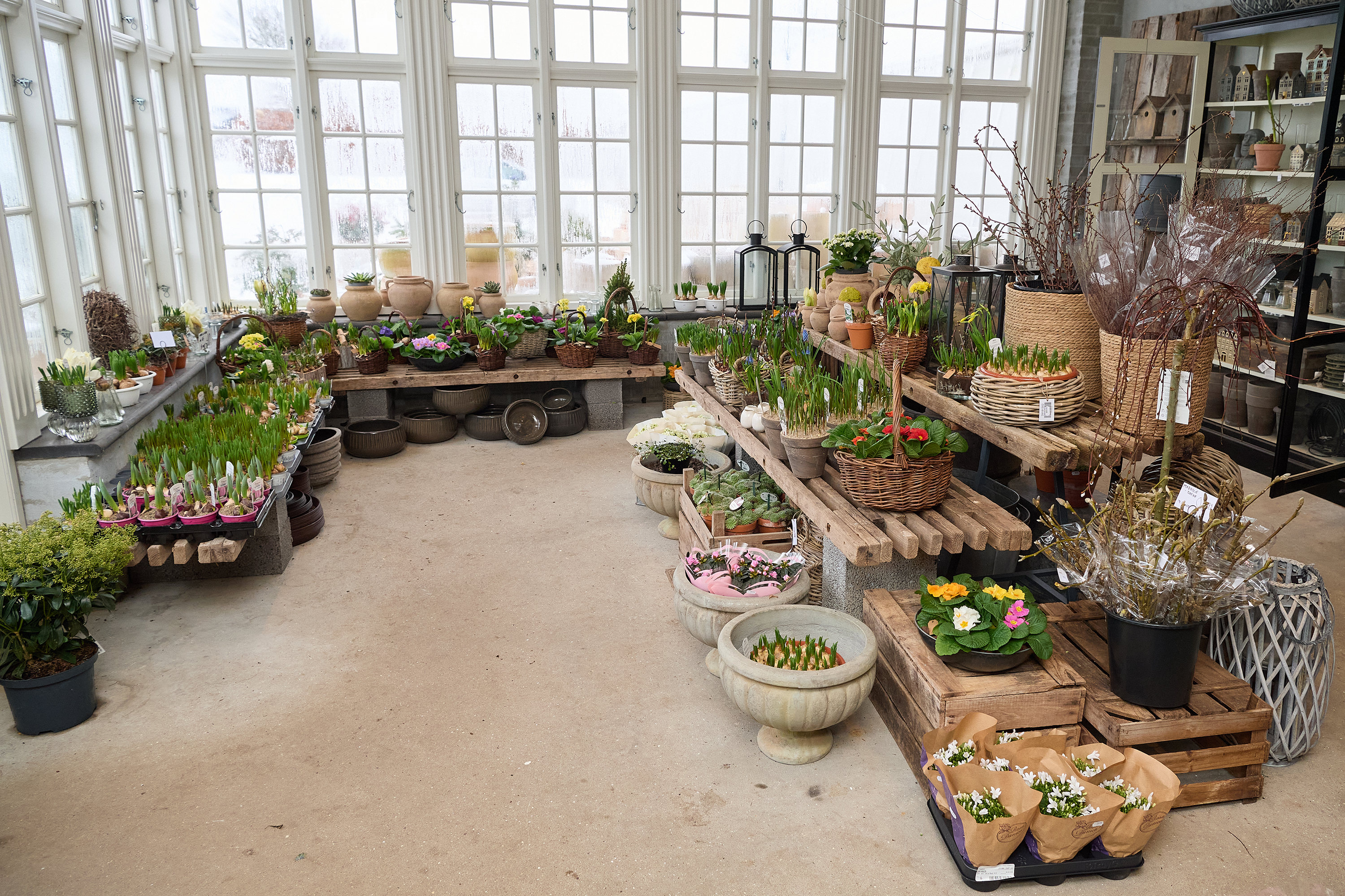 Netop nu bugner gartneriets drivhuse, og sæsonens planter står på spring i urtepotterne. Et væld af farver fra primulaer i mange lag fanger straks øjet.