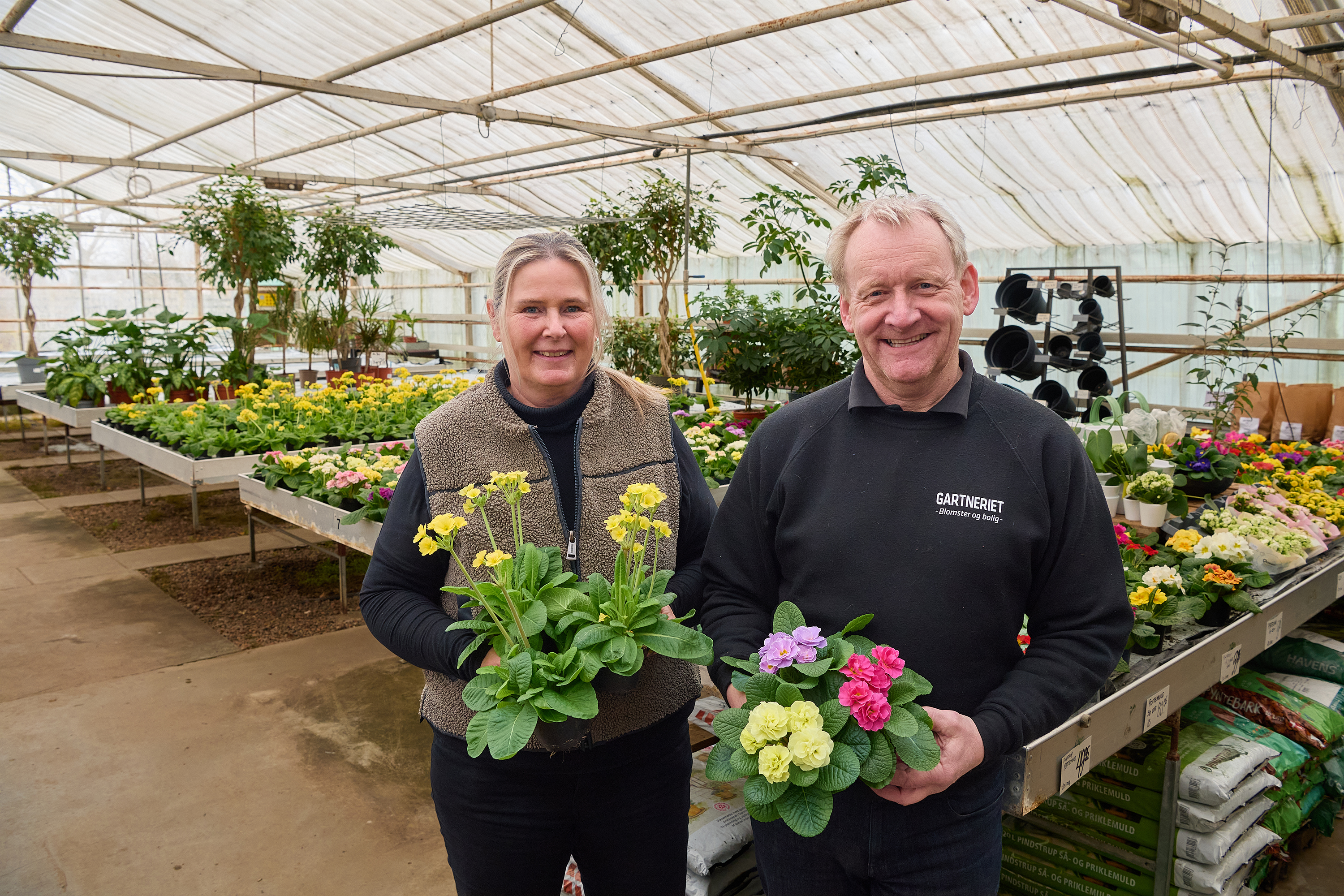 Det er imidlertid ikke kun gartneriet, der har undergået lidt af en forvandling. Det samme har ejerparrets liv og hverdag. Det stod ikke i kortene, at de i en voksen alder skulle springe ud som selvstændige gartneri-ejere. Begge har en købmandsfaglig baggrund og flere årtier hos Coop på cv’et.